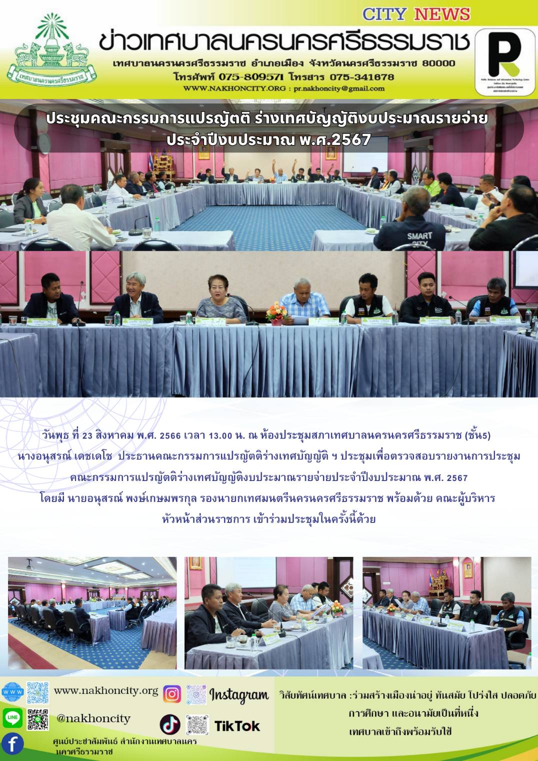 วันพุธ ที่ 23 สิงหาคม พ.ศ. 2566 เวลา 13.00 น. ณ ห้องประชุมสภาเทศบาลนครนครศรีธรรมราช (ชั้น5) นางอนุสรณ์ เดชเดโช ประธานคณะกรรมการแปรญัตติร่างเทศบัญญัติ ฯ ประชุมเพื่อตรวจสอบรายงานการประชุมคณะกรรมการแปรญัตติร่างเทศบัญญัติงบประมาณรายจ่ายประจำปีงบประมาณ พ.ศ. 2567 |