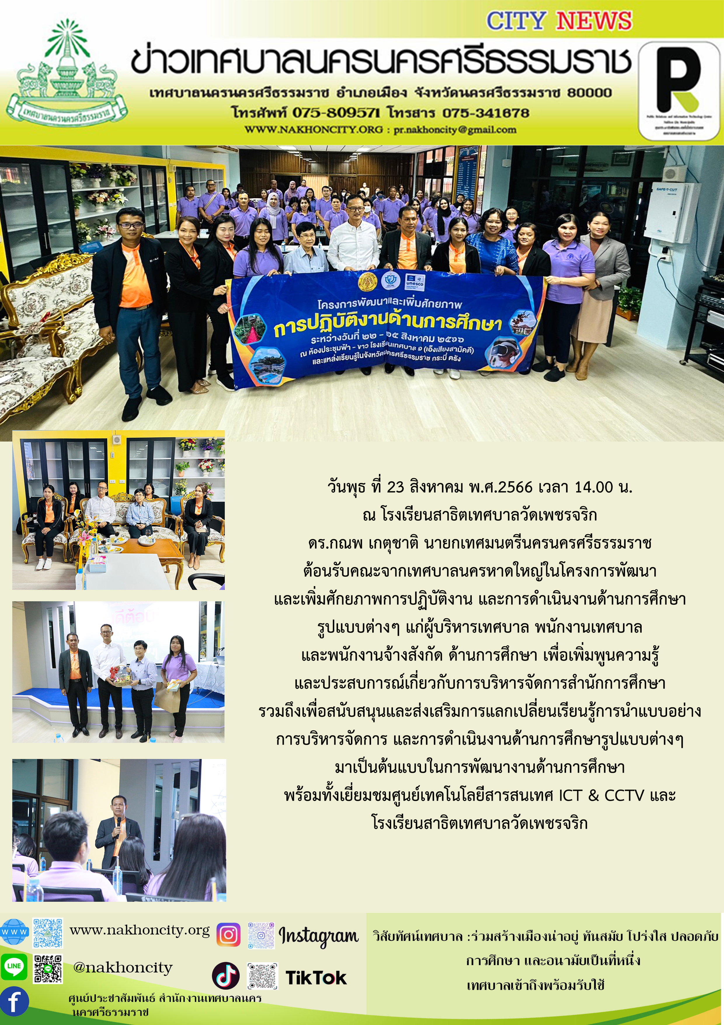 ดร.กณพ เกตุชาติ นายกเทศมนตรีนครนครศรีธรรมราช ต้อนรับคณะจากเทศบาลนครหาดใหญ่ในโครงการพัฒนาและเพิ่มศักยภาพการปฏิบัติงาน และการดำเนินงานด้านการศึกษารูปแบบต่างๆ แก่ผู้บริหารเทศบาล พนักงานเทศบาล และพนักงานจ้างสังกัด ด้านการศึกษา |