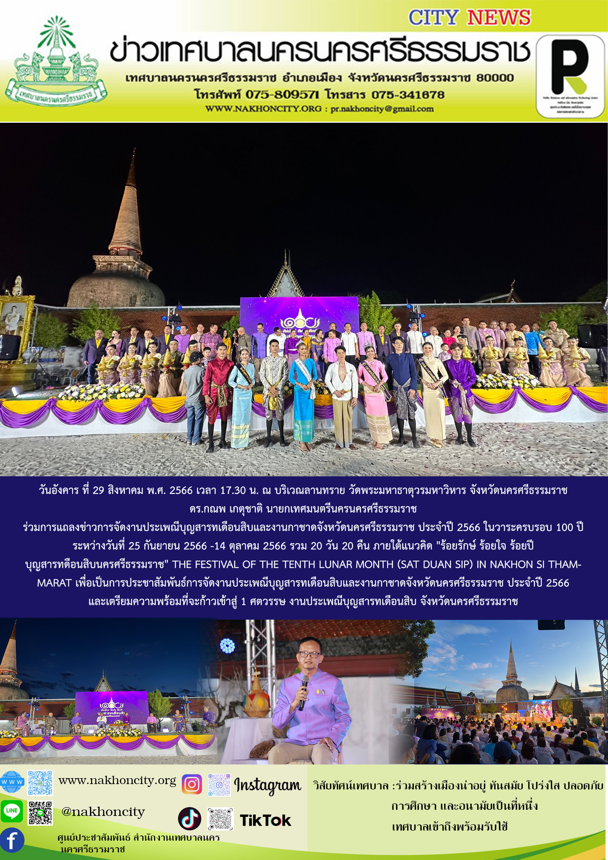ดร.กณพ เกตุชาติ นายกเทศมนตรีนครนครศรีธรรมราช ร่วมการแถลงข่าวการจัดงานประเพณีบุญสารทเดือนสิบและงานกาชาดจังหวัดนครศรีธรรมราช ประจำปี 2566 ในวาระครบรอบ 100 ปี ระหว่างวันที่ 25 กันยายน 2566 -14 ตุลาคม 2566 รวม 20 วัน 20 คืน ภายใต้แนวคิด "ร้อยรักษ์ ร้อยใจ ร้อยปี บุญสารทดือนสิบนครศรีธรรมราช" THE FESTIVAL OF THE TENTH LUNAR MONTH (SAT DUAN SIP) IN NAKHON SI THAMMARAT |