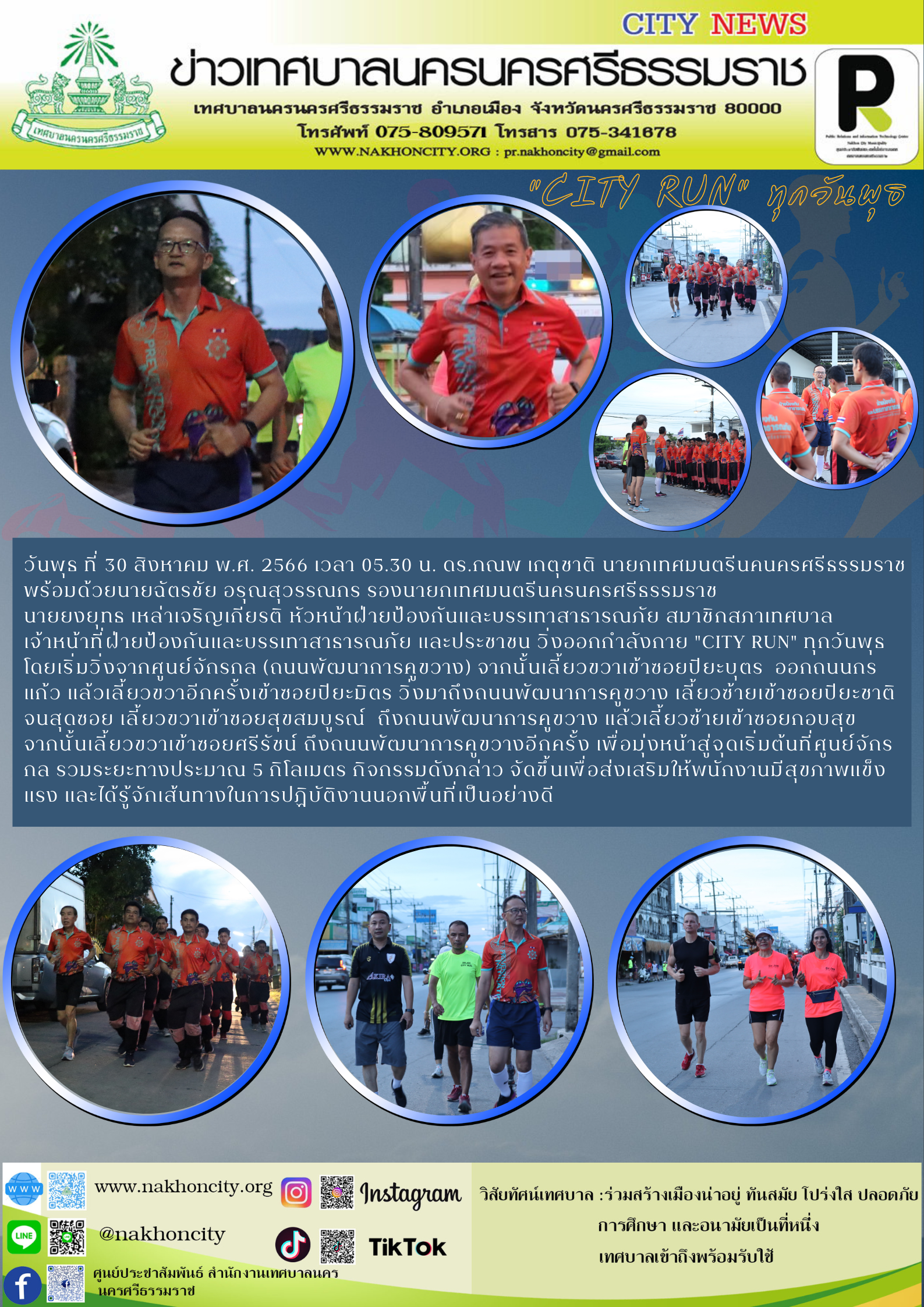 ดร.กณพ เกตุชาติ นายกเทศมนตรีนครนครศรีธรรมราช นำเจ้าหน้าที่ฝ่ายป้องกันและบรรเทาสาธารณภัย และประชาชน วิ่งออกกำลังกาย "CITY RUN" ทุกวันพุธ |