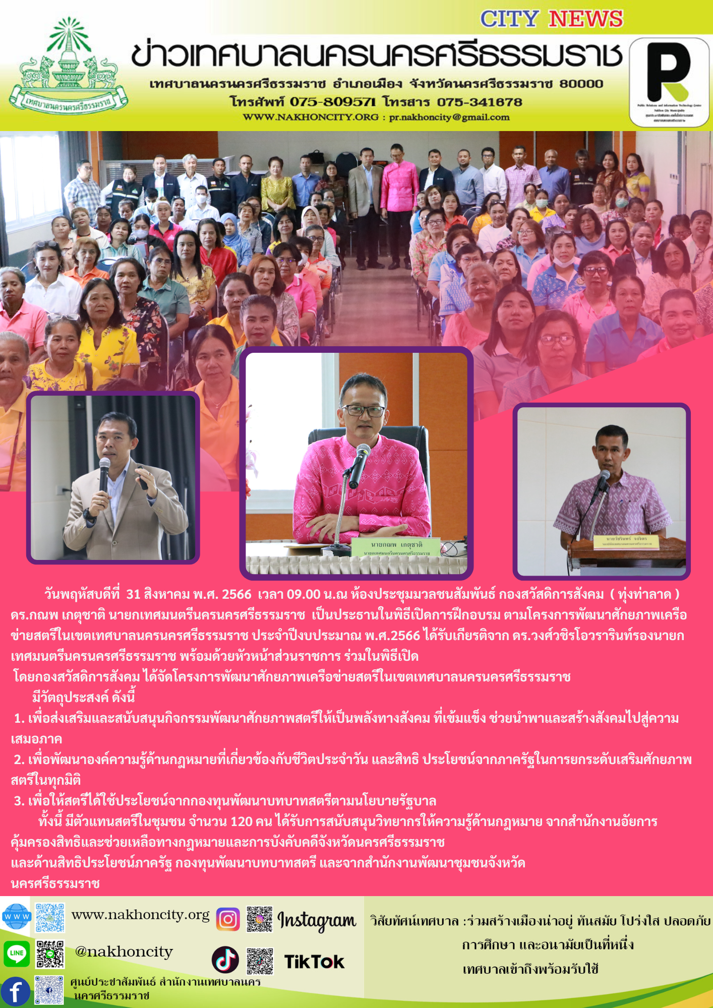 ดร.กณพ เกตุชาติ นายกเทศมนตรีนครนครศรีธรรมราช เป็นประธานในพิธีเปิดการฝึกอบรม ตามโครงการพัฒนาศักยภาพเครือข่ายสตรีในเขตเทศบาลนครนครศรีธรรมราช ประจำปีงบประมาณ พ.ศ.2566 |