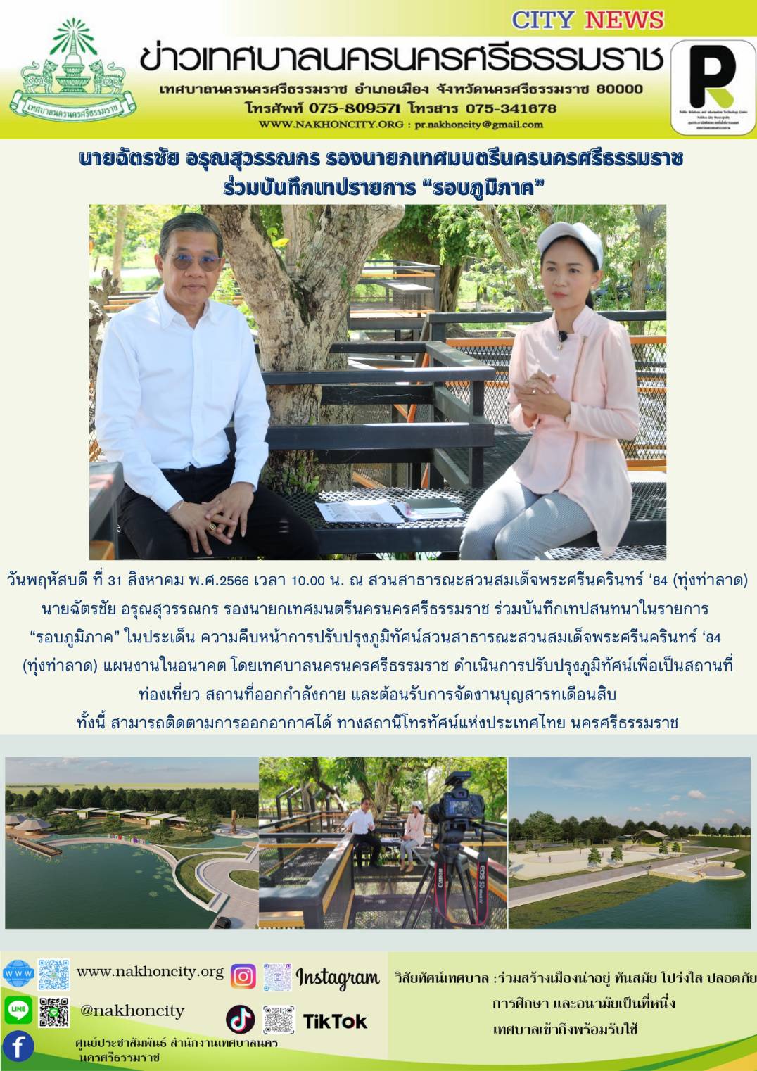 วันพฤหัสบดี ที่ 31 สิงหาคม พ.ศ.2566 เวลา 10.00 น. ณ สวนสาธารณะสวนสมเด็จพระศรีนครินทร์ ‘84 (ทุ่งท่าลาด) นายฉัตรชัย อรุณสุวรรณกร รองนายกเทศมนตรีนครนครศรีธรรมราช ร่วมบันทึกเทปสนทนาในรายการ “ รอบภูมิภาค ” ในประเด็น ความคืบหน้าการปรับปรุงภูมิทัศน์สวนสาธารณะสวนสมเด็จพระศรีนครินทร์ ‘84 (ทุ่งท่าลาด) แผนงานในอนาคต โดยเทศบาลนครนครศรีธรรมราช ดำเนินการปรับปรุงภูมิทัศน์เพื่อเป็นสถานที่ท่องเที่ยว สถานที่ออกกำลังกาย และต้อนรับการจัดงานบุญสารทเดือนสิบ ทั้งนี้ สามารถติดตามการออกอากาศได้ ทางสถานีโทรทัศน์แห่งประเทศไทย นครศรีธรรมราช ............... ภาพ//ข่าว//จันทร์จิรา ตรวจทาน//ฐิตินันท์ |