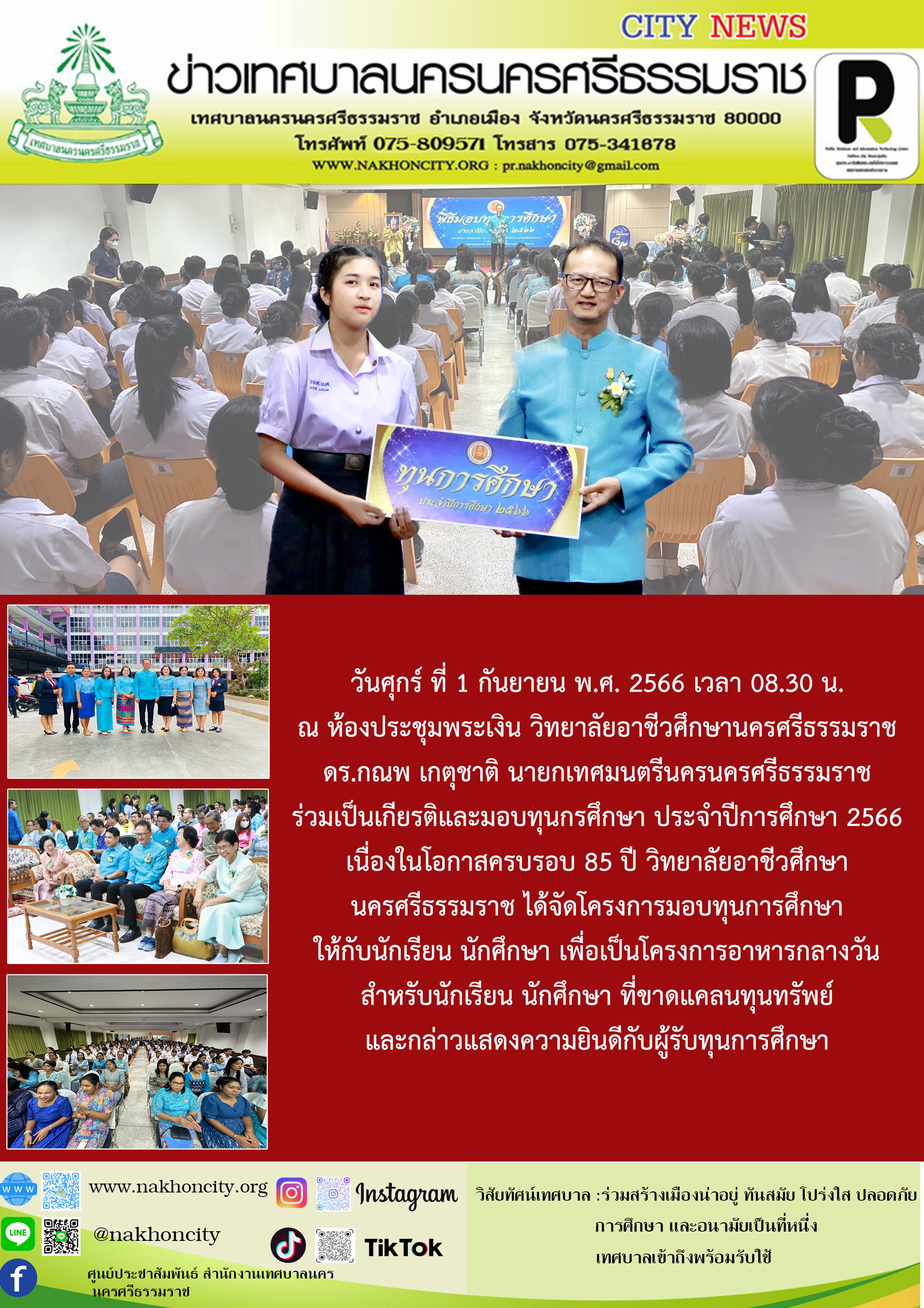 ดร.กณพ เกตุชาติ นายกเทศมนตรีนครนครศรีธรรมราช ร่วมเป็นเกียรติและมอบทุนกรศึกษา ประจำปีการศึกษา 2566 เนื่องในโอกาสครบรอบ 85 ปี |