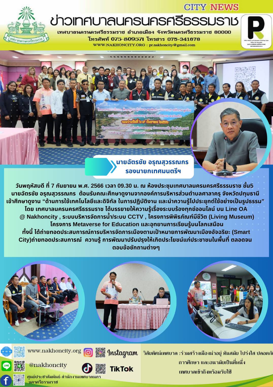 วันพฤหัสบดี ที่ 7 กันยายน พ.ศ. 2566 เวลา 09.30 น. ณ ห้องประชุมเทศบาลนครนครศรีธรรมราช ชั้น5 นายฉัตรชัย อรุณสุวรรณกร ต้อนรับคณะศึกษาดูงานจากองค์การบริหารส่วนตำบลศาลาครุ จังหวัดปทุมธานี เข้าศึกษาดูงาน “ด้านการใช้เทคโนโลยีและดิจิทัล ในการปฏิบัติงาน และนำความรู้ไปประยุกต์ใช้อย่างเป็นรูปธรรม” |
