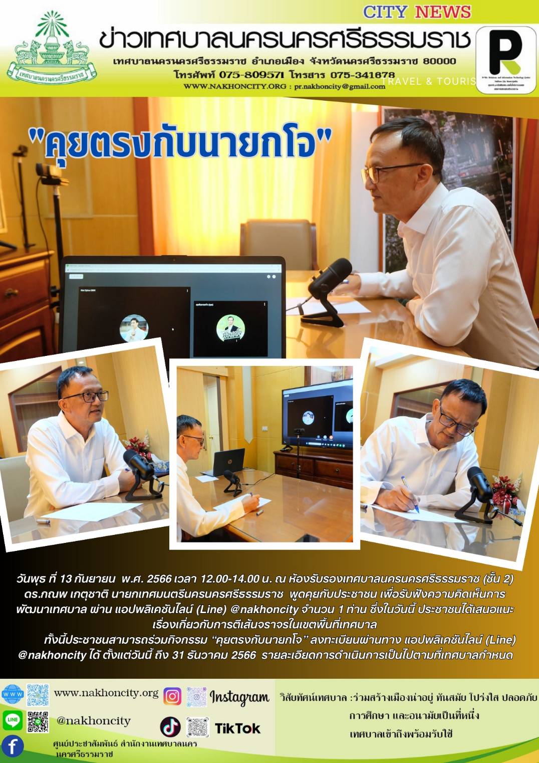 ดร.กณพ เกตุชาติ นายกเทศมนตรีนครนครศรีธรรมราช พูดคุยกับประชาชน เพื่อรับฟังความคิดเห็นการพัฒนาเทศบาล ผ่าน แอปพลิเคชันไลน์ (Line) @nakhoncity |