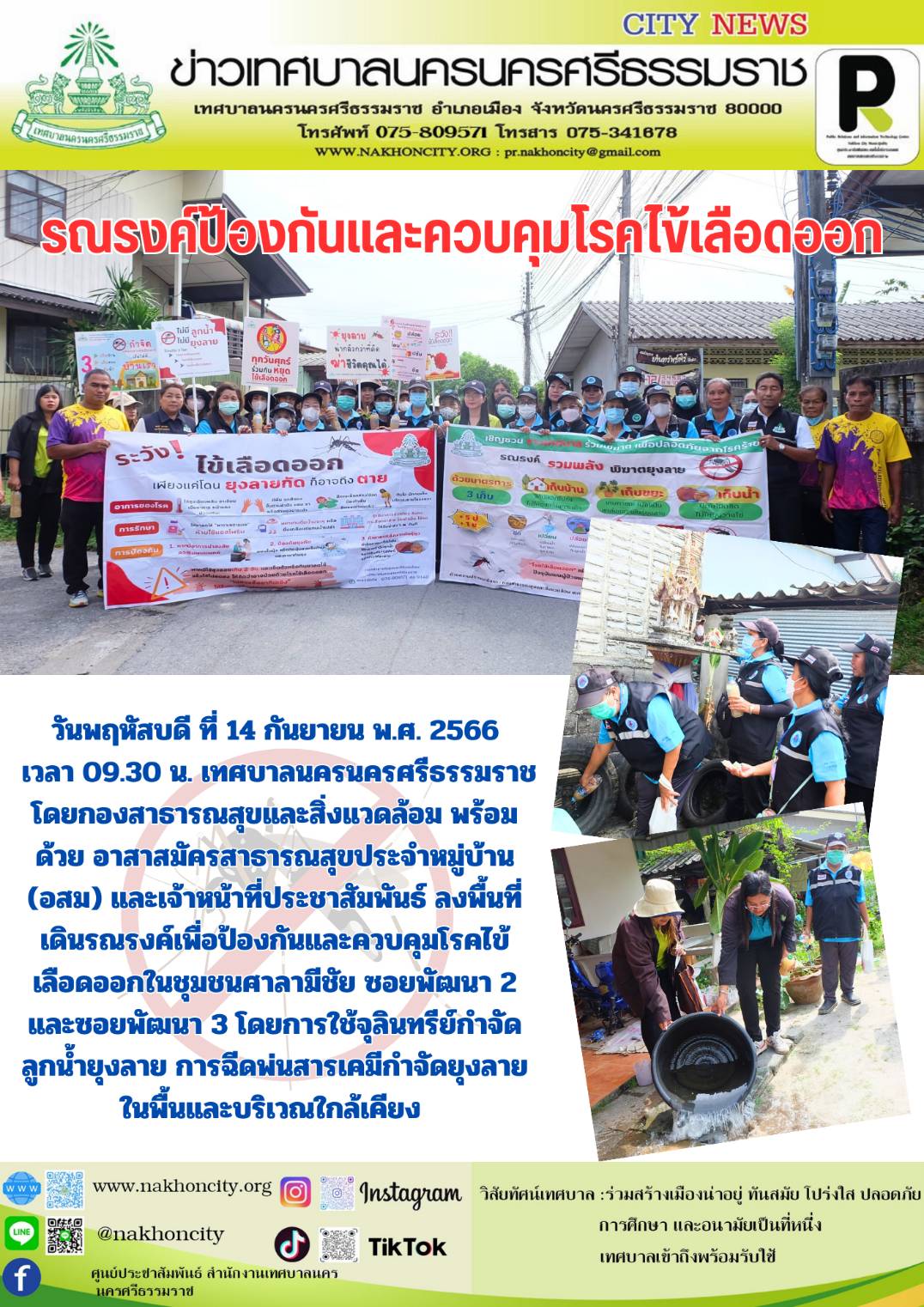 เทศบาลนครนครศรีธรรมราช โดยกองสาธารณสุขและสิ่งแวดล้อม พร้อมด้วย อาสาสมัครสาธารณสุขประจำหมู่บ้าน (อสม) และเจ้าหน้าที่ประชาสัมพันธ์ ลงพื้นที่เดินรณรงค์เพื่อป้องกันและควบคุมโรคไข้เลือดออก |