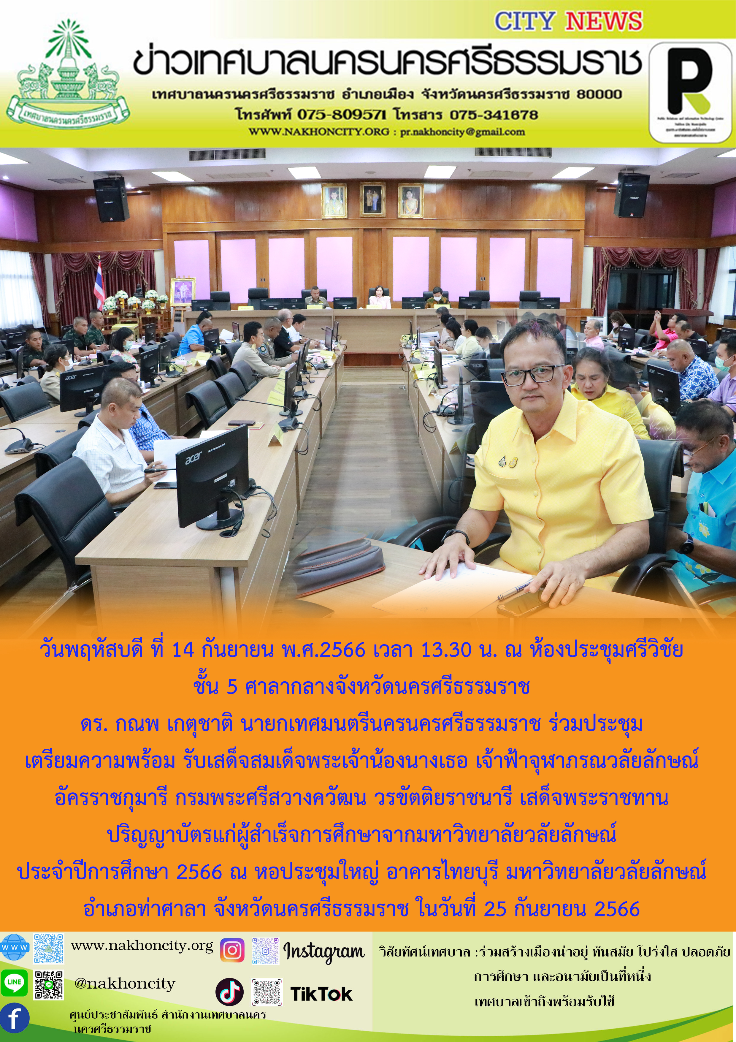 ดร. กณพ เกตุชาติ นายกเทศมนตรีนครนครศรีธรรมราช ร่วมประชุมเตรียมความพร้อมรับเสด็จสมเด็จพระเจ้าน้องนางเธอ เจ้าฟ้าจุฬาภรณวลัยลักษณ์ อัครราชกุมารี กรมพระศรีสวางควัฒน วรขัตติยราชนารี เสด็จพระราชทานปริญญาบัตรแก่ผู้สำเร็จการศึกษาจากมหาวิทยาลัยวลัยลักษณ์ ประจำปีการศึกษา 2566 |