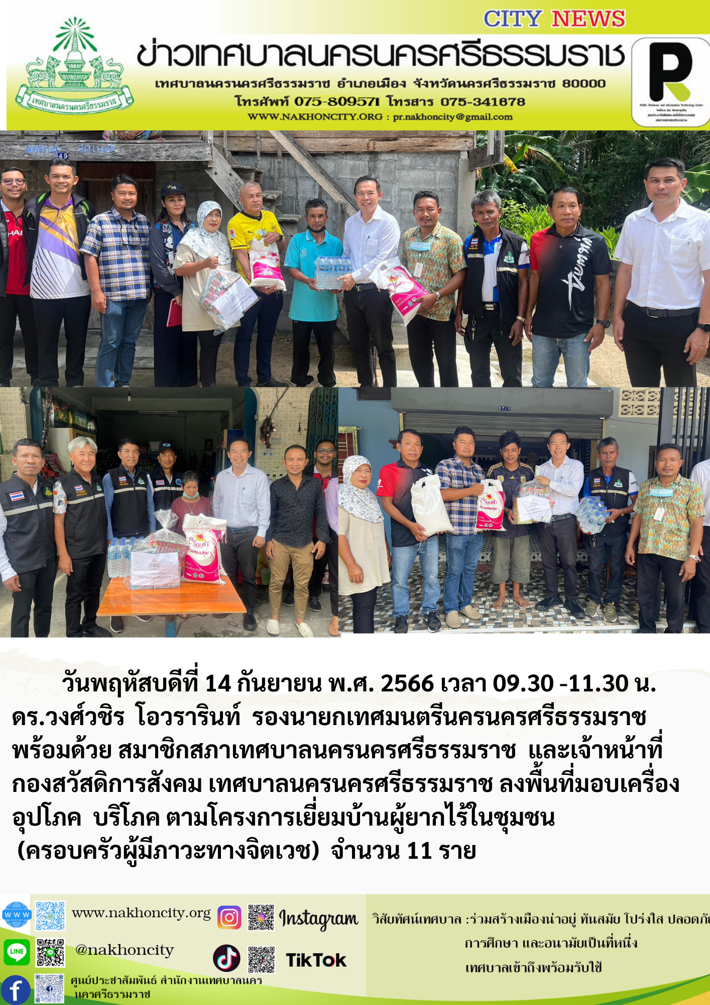 วันพฤหัสบดีที่ 14 กันยายน พ.ศ. 2566 เวลา 09.30 -11.30 น. ดร.วงศ์วชิร โอวรารินท์ รองนายกเทศมนตรีนครนครศรีธรรมราช พร้อมด้วย สมาชิกสภาเทศบาลนครนครศรีธรรมราช และเจ้าหน้าที่กองสวัสดิการสังคม เทศบาลนครนครศรีธรรมราช ลงพื้นที่มอบเครื่องอุปโภค บริโภค ตามโครงการเยี่ยมบ้านผู้ยากไร้ในชุมชน (ครอบครัวผู้มีภาวะทางจิตเวช) จำนวน 11 ราย |