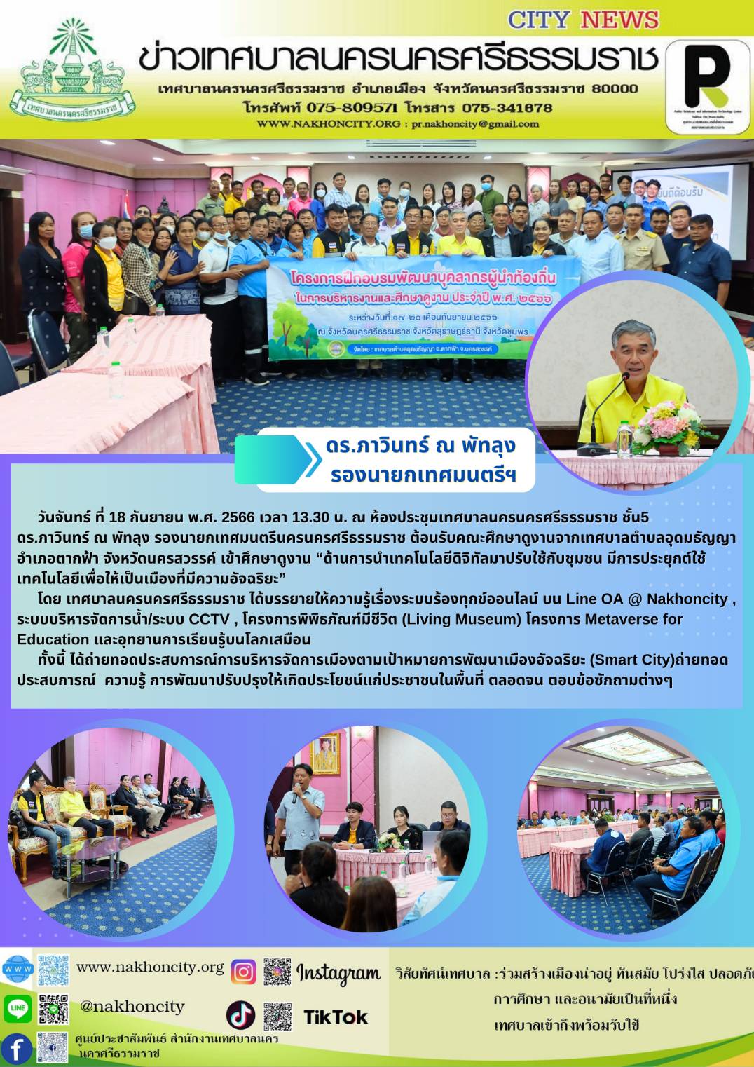 วันจันทร์ ที่ 18 กันยายน พ.ศ. 2566 เวลา 13.30 น. ณ ห้องประชุมเทศบาลนครนครศรีธรรมราช ชั้น5 ดร.ภาวินทร์ ณ พัทลุง รองนายกเทศมนตรีนครนครศรีธรรมราช ต้อนรับคณะศึกษาดูงานจากเทศบาลตำบลอุดมธัญญา อำเภอตากฟ้า จังหวัดนครสวรรค์ เข้าศึกษาดูงาน “ด้านการนำเทคโนโลยีดิจิทัลมาปรับใช้กับชุมชน มีการประยุกต์ใช้เทคโนโลยีเพื่อให้เป็นเมืองที่มีความอัจฉริยะ” |