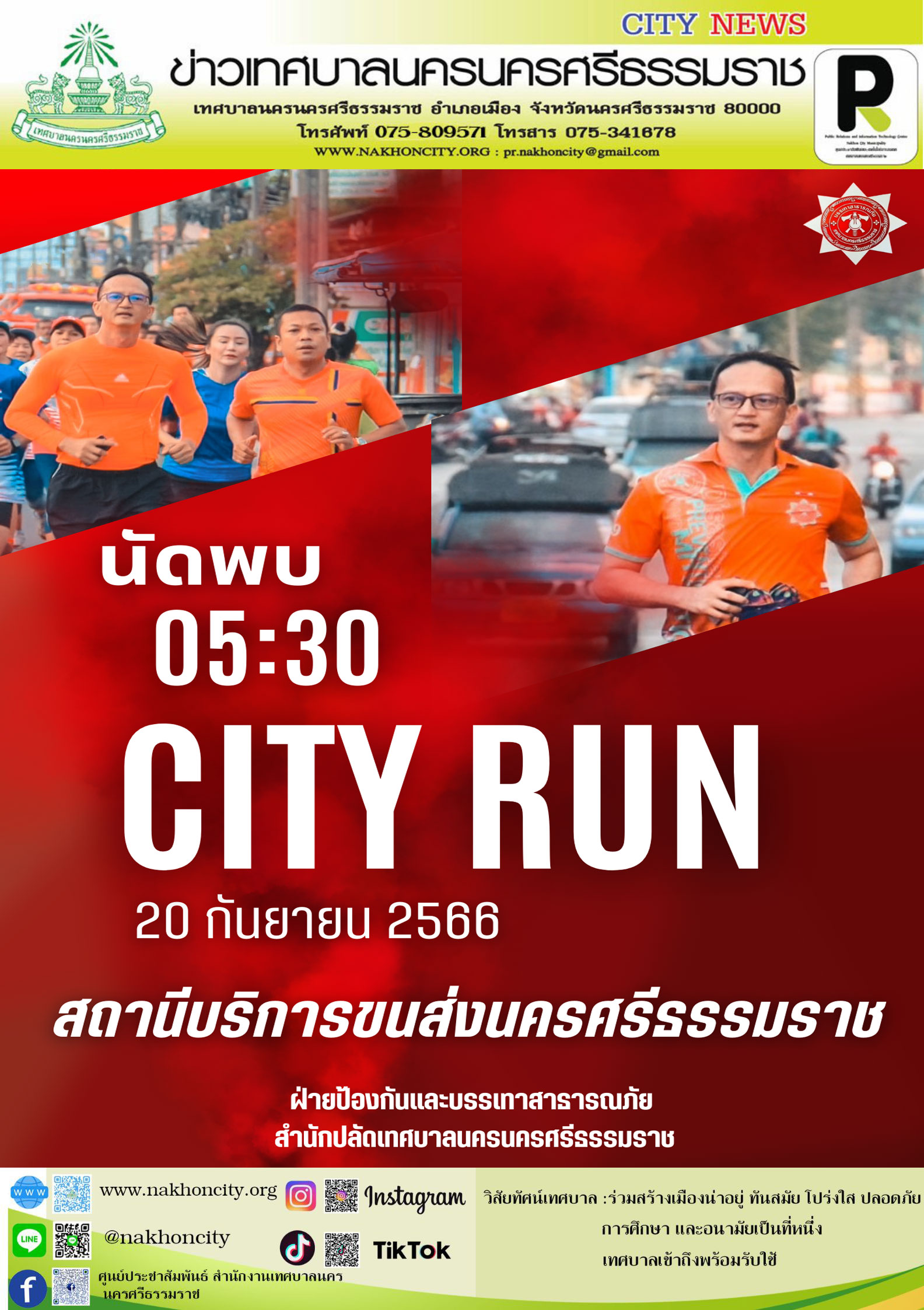 เทศบาลนครนครศรีธรรมราช ภายใต้การนำ ดร.กณพ เกตุชาติ นายกเทศมนตรีนครนครศรีธรรมราช เชิญชวนประชาชน ร่วมวิ่งออกกำลังกาย ทุกเช้าวันพุธ เวลา 05.30 น.เป็นต้นไป กับกิจกรรม "City Run" พร้อมกับ เจ้าหน้าฝ่ายป้องกันและบรรเทาสาธารณภัย และบุคลากร ของ เทศบาลนครนครศรีธรรมราช ซึ่งใน วันพุธที่ 20 กันยายน 2566 นี้ ขอเชิญชวนผู้ที่จะเข้าร่วมกิจกรรมทุกท่าน พบกันที่ สถานีขนส่ง วิ่งไปทางถนนชลประทาน เลี้ยวซ้ายที่ซอยทุ่งจีน ออกถนนกะโรม วิ่งกลับมาที่สถานีขนส่ง เพื่อสร้างสุขภาพร่างกายที่ดี ไปด้วยกันกับเทศบาลนครนครศรีธรรมราช