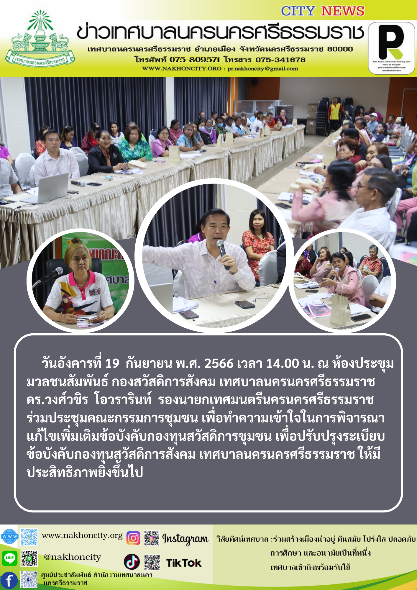 วันอังคารที่ 19 กันยายน พ.ศ. 2566 เวลา 14.00 น. ณ ห้องประชุม มวลชนสัมพันธ์ กองสวัสดิการสังคม เทศบาลนครนครศรีธรรมราช ดร.วงศ์วชิร โอวรารินท์ รองนายกเทศมนตรีนครนครศรีธรรมราช ร่วมประชุมคณะกรรมการชุมชน เพื่อทำความเข้าใจในการพิจารณาแก้ไขเพิ่มเติมข้อบังคับกองทุนสวัสดิการชุมชน เพื่อปรับปรุงระเบียบข้อบังคับกองทุนสวัสดิการสังคม เทศบาลนครนครศรีธรรมราช ให้มีประสิทธิภาพยิ่งขึ้นไป |