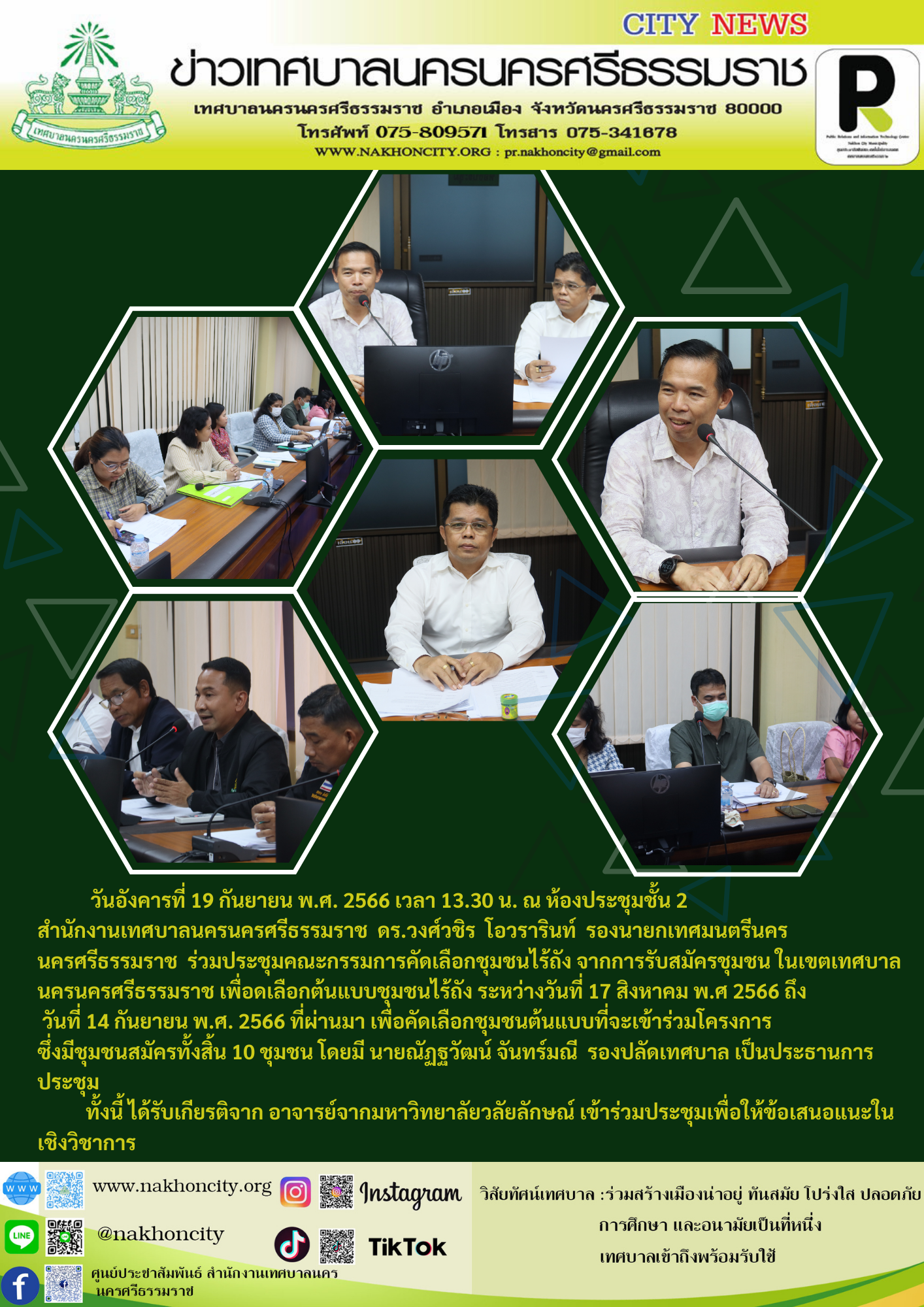ดร.วงศ์วชิร โอวรารินท์ รองนายกเทศมนตรีนครนครศรีธรรมราช ร่วมประชุมคณะกรรมการคัดเลือกชุมชนไร้ถัง จากการรับสมัครชุมชน ในเขตเทศบาลนครนครศรีธรรมราช เพื่อดเลือกต้นแบบชุมชนไร้ถัง ระหว่างวันที่ 17 สิงหาคม พ.ศ 2566 ถึง วันที่ 14 กันยายน พ.ศ. 2566 ที่ผ่านมา เพื่อคัดเลือกชุมชนต้นแบบที่จะเข้าร่วมโครงการ ซึ่งมีชุมชนสมัครทั้งสิ้น 10 ชุมชน โดยมี นายณัฏฐวัฒน์ จันทร์มณี รองปลัดเทศบาล เป็นประธานการประชุม |