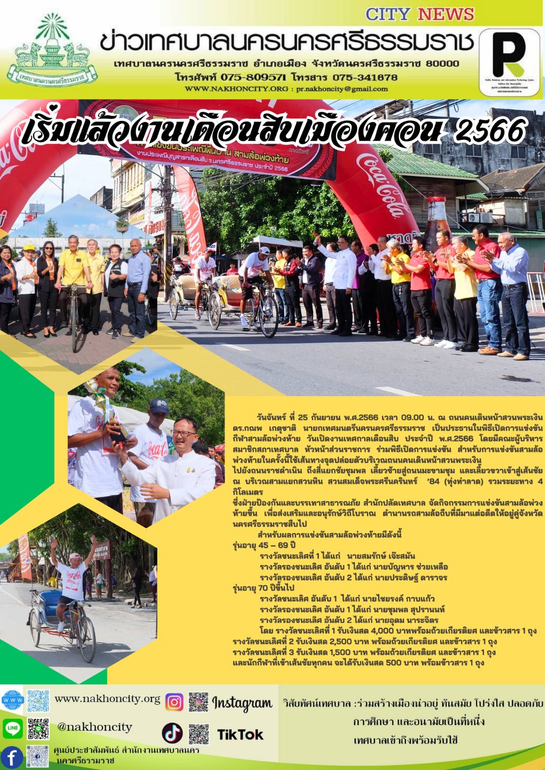 วันจันทร์ ที่ 25 กันยายน พ.ศ.2566 เวลา 09.00 น. ณ ถนนคนเดินหน้าสวนพระเงิน ดร.กณพ เกตุชาติ นายกเทศมนตรีนครนครศรีธรรมราช เป็นประธานในพิธีเปิดการแข่งขันกีฬาสามล้อพ่วงท้าย วันเปิดงานเทศกาลเดือนสิบ ประจำปี พ.ศ.2566 โดยมีคณะผู้บริหาร สมาชิกสภาเทศบาล หัวหน้าส่วนราชการ ร่วมพิธีเปิดการแข่งขัน สำหรับการแข่งขันสามล้อพ่วงท้ายในครั้งนี้ใช้เส้นทางจุดปล่อยตัวบริเวณถนนคนเดินหน้าสวนพระเงิน ไปยังถนนราชดำเนิน ถึงสี่แยกชัยชุมพล เลี้ยวซ้ายสู่ถนนมะขามชุม และเลี้ยวขวาเข้าสู่เส้นชัย ณ บริเวณสามแยกสวนหิน สวนสมเด็จพระศรีนครินทร์ ‘84 (ทุ่งท่าลาด) รวมระยะทาง 4 กิโลเมตร ซึ่งฝ่ายป้องกันและบรรเทาสาธารณภัย สำนักปลัดเทศบาล จัดกิจกรรมการแข่งขันสามล้อพ่วงท้ายขึ้น เพื่อส่งเสริมและอนุรักษ์วิถีโบราณ ตำนานรถสามล้อถีบที่มีมาแต่อดีตให้อยู่คู่จังหวัดนครศรีธรรมราชสืบไป สำหรับผลการแข่งขันสามล้อพ่วงท้ายมีดังนี้ รุ่นอายุ 45 – 69 ปี รางวัลชนะเลิศที่ 1 ได้แก่ นายสมรักษ์ เจ๊ะสมัน รางวัลรองชนะเลิศ อันดับ 1 ได้แก่ นายบัญหาร ช่วยเหลือ รางวัลรองชนะเลิศ อันดับ 2 ได้แก่ นายประดิษฐ์ ดาราจร รุ่นอายุ 70 ปีขึ้นไป รางวัลชนะเลิศ อันดับ 1 ได้แก่ นายไชยรงค์ กาบแก้ว รางวัลรองชนะเลิศ อันดับ 1 ได้แก่ นายชุมพล สุปรานนท์ รางวัลรองชนะเลิศ อันดับ 2 ได้แก่ นายอุดม นาระจิตร โดย รางวัลชนะเลิศที่ 1 รับเงินสด 4,000 บาทพร้อมถ้วยเกียรติยศ และข้าวสาร 1 ถุง รางวัลชนะเลิศที่ 2 รับเงินสด 2,500 บาท พร้อมถ้วยเกียรติยศ และข้าวสาร 1 ถุง รางวัลชนะเลิศที่ 3 รับเงินสด 1,500 บาท พร้อมถ้วยเกียรติยศ และข้าวสาร 1 ถุง และนักกีฬาที่เข้าเส้นชัยทุกคน จะได้รับเงินสด 500 บาท พร้อมข้าวสาร 1 ถุง ............ ภาพ//ข่าว//จันทร์จิรา ตรวจทาน//ฐิตินันท์ |