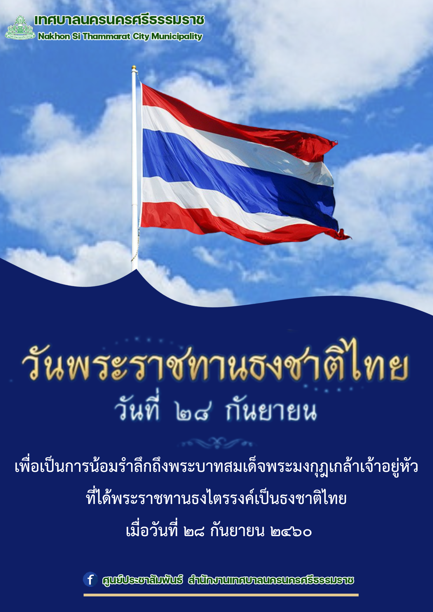 วันพระราชทานธงชาติไทย วันที่ 28 กันยายน เพื่อเป็นการน้อมรำลึกถึงพระบาทสมเด็จพระมงกุฎเกล้าเจ้าอยู่หัว ที่ได้พระราชทานธงไตรรงค์เป็นธงชาติไทย เมื่อวันที่ ๒๘ กันยายน ๒๔๖๐ |