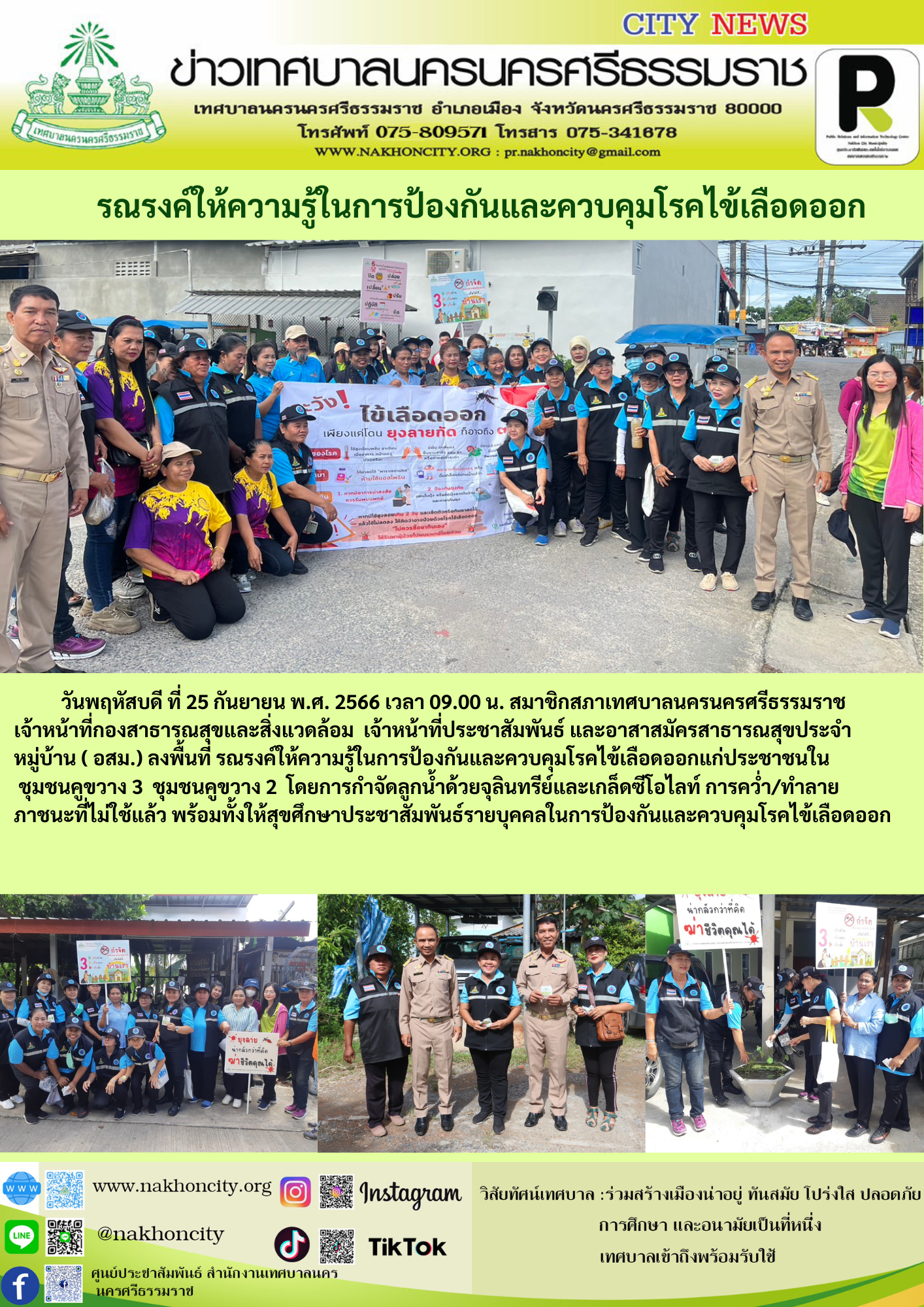 กองสาธารณสุขและสิ่งแวดล้อมเทศบาลนครนครศรีธรรมราช ลงพื้นที่รณรงค์ให้ความรู้ในการป้องกันและควบคุมโรคไข้เลือดออก |
