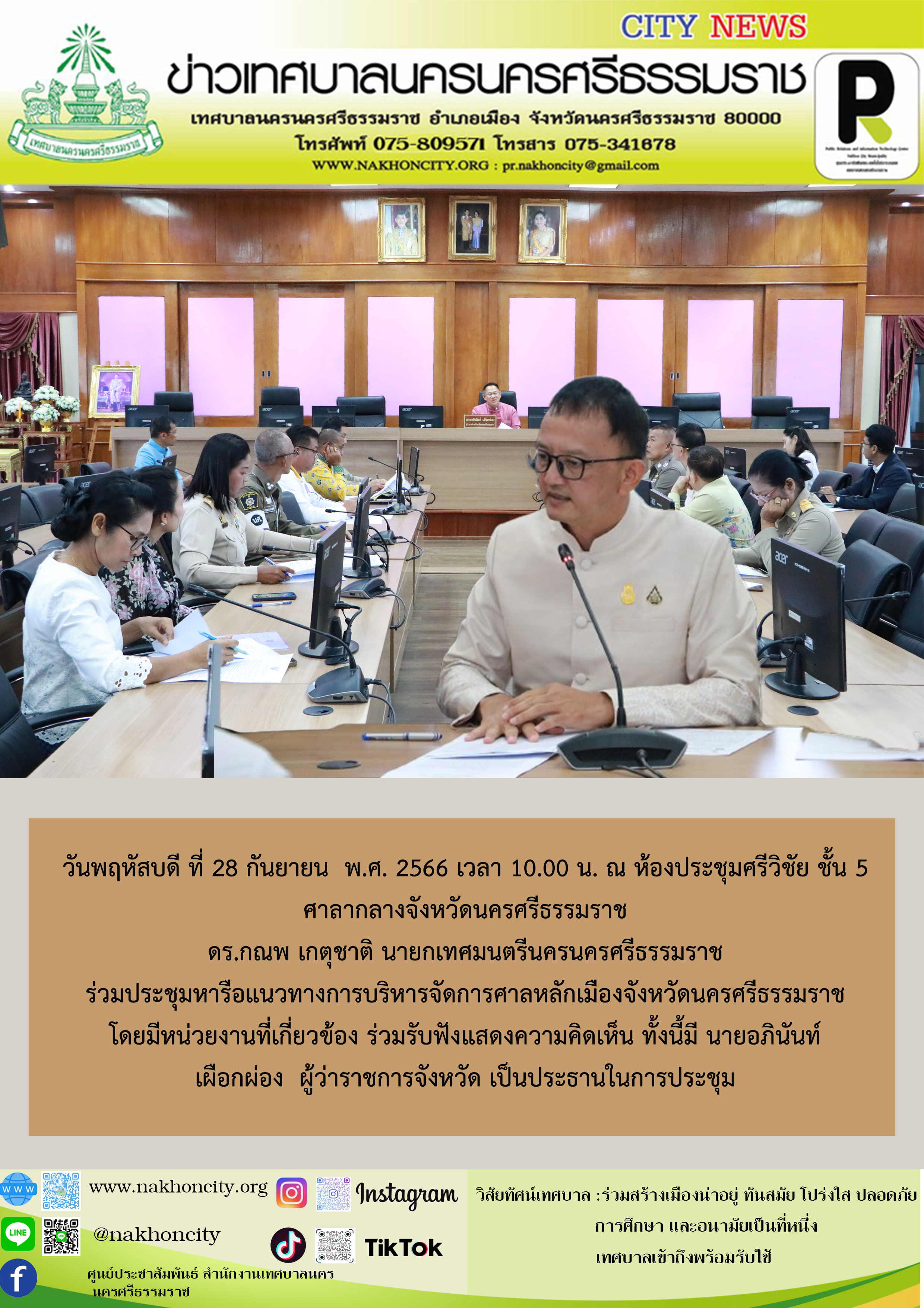 วันพฤหัสบดี ที่ 28 กันยายน พ.ศ. 2566 เวลา 10.00 น. ณ ห้องประชุมศรีวิชัย ชั้น 5 ศาลากลางจังหวัดนครศรีธรรมราช