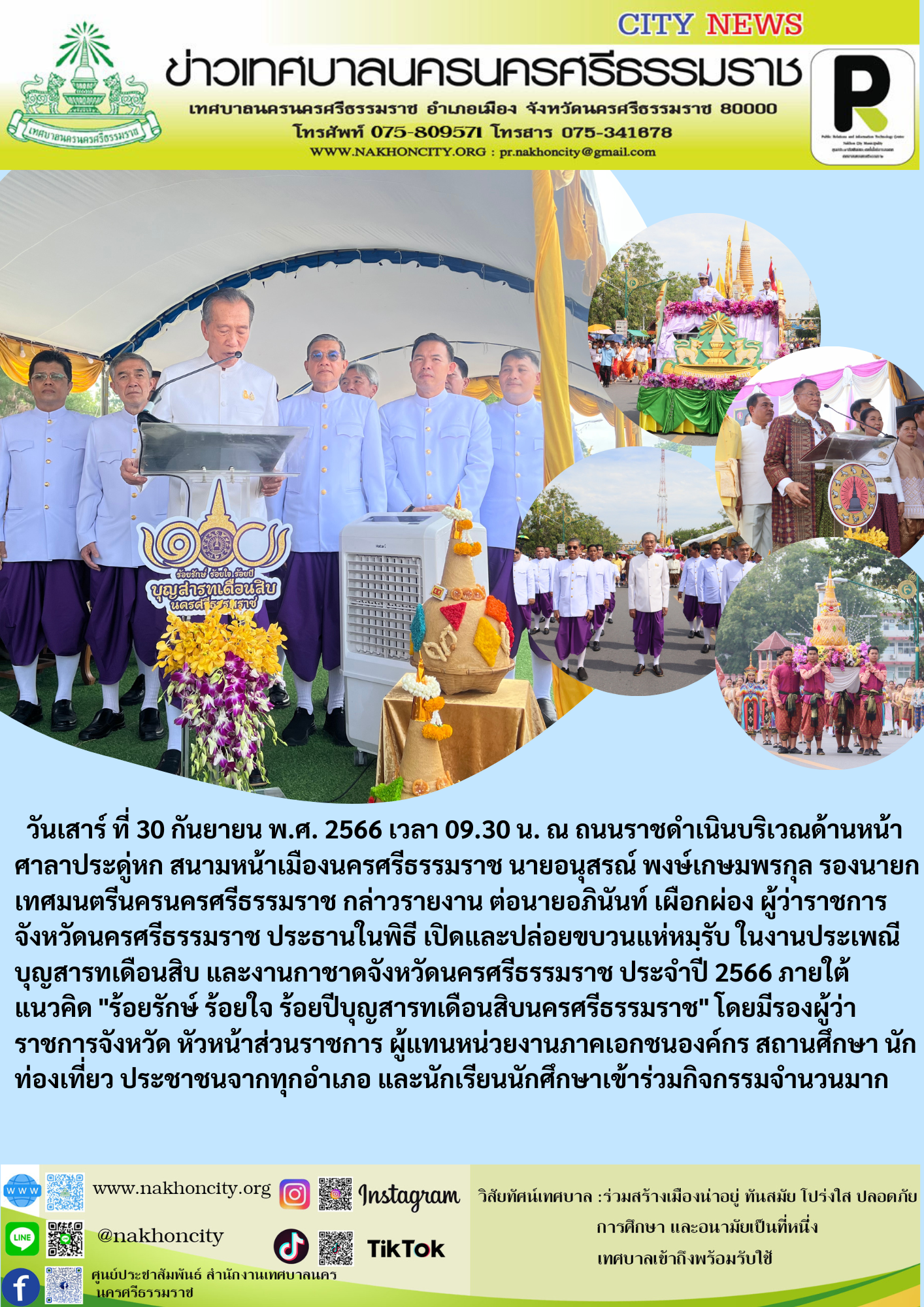 วันเสาร์ ที่ 30 กันยายน พ.ศ. 2566 เวลา 09.30 น. ณ ถนนราชดำเนินบริเวณด้านหน้าศาลาประดู่หก สนามหน้าเมืองนครศรีธรรมราช นายอนุสรณ์ พงษ์เกษมพรกุล รองนายกเทศมนตรีนครนครศรีธรรมราช กล่าวรายงาน ต่อนายอภินันท์ เผือกผ่อง ผู้ว่าราชการจังหวัดนครศรีธรรมราช ประธานในพิธี เปิดและปล่อยขบวนแห่หมฺรับ ในงานประเพณีบุญสารทเดือนสิบ และงานกาชาดจังหวัดนครศรีธรรมราช ประจำปี 2566 ภายใต้แนวคิด "ร้อยรักษ์ ร้อยใจ ร้อยปีบุญสารทเดือนสิบนครศรีธรรมราช" โดยมีรองผู้ว่าราชการจังหวัด หัวหน้าส่วนราชการ ผู้แทนหน่วยงานภาคเอกชนองค์กร สถานศึกษา นักท่องเที่ยว ประชาชนจากทุกอำเภอ และนักเรียนนักศึกษาเข้าร่วมกิจกรรมจำนวนมาก ประเพณีบุญสารทเดือนสิบ เป็นประเพณีอันสำคัญและยิ่งใหญ่คู่เมืองนครศรีธรรมราช เป็นประเพณีที่แสดงออกถึงความกตัญญูกตเวทีต่อบุพการีและบรรพบุรุษผู้ล่วงลับ ซึ่งชาวจังหวัดนครศรีธรรมราช เชื่อว่า ในวันแรม 1 ค่ำเดือน 10 บรรพบุรุษที่ล่วงลับไปแล้ว จะได้รับอนุญาตจากนายนิรยบาล ให้ขึ้นมาสู่โลกมนุษย์ เพื่อมารับส่วนบุญส่วนกุศลจากลูกหลาน และจะกลับสู่เปรตภูมิในวันแรม 15 ค่ำเดือน 10 ลูกหลานชาวนครศรีธรรมราช ได้ถือปฏิบัติสืบทอดกิจกรรมแห่หมฺรับกันมาช้านาน เพื่อร่วมกันรักษาประเพณีให้คงอยู่สืบไป และเพื่อเป็นการส่งเสริมการท่องเที่ยว ซึ่งในปีนี้มีหน่วยงานราชการ รัฐวิสาหกิจ กลุ่มอำเภอ องค์กรปกครองส่วนท้องถิ่น สถานศึกษา และภาคเอกชน จัดส่งหมฺรับเข้าร่วมกิจกรรม พร้อมทั้งมีการตกแต่งริ้วขบวนแห่หมฺรับอย่างสวยงาม ยิ่งใหญ่ตระการตา บ่งบอกถึงวิถีชีวิตอันเป็นเอกลักษณ์ที่โดดเด่นในแต่ละพื้นที่ พร้อมทั้งมีการละเล่นพื้นบ้าน ขบวนแห่กลองยาว การแสดงศิลปะวัฒนธรรมท้องถิ่นพร้อมหุ่นเปรตเข้าร่วมในริ้วขบวนแห่งหมฺรับด้วย |