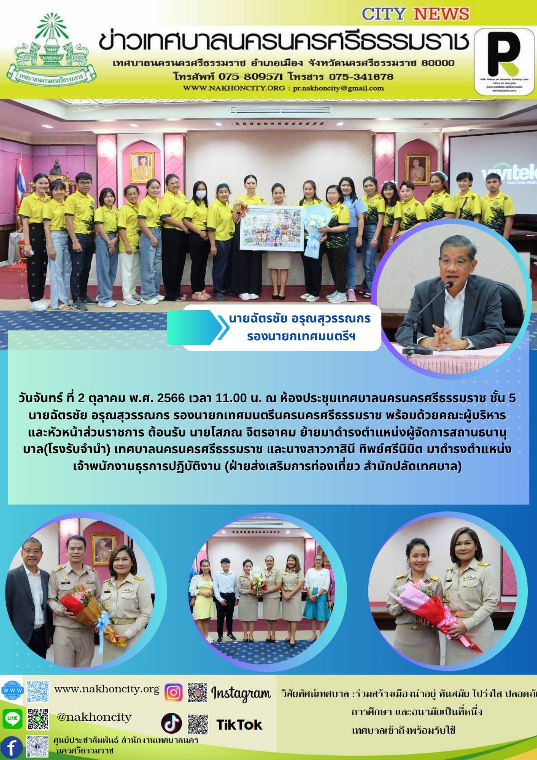 วันจันทร์ ที่ 2 ตุลาคม พ.ศ. 2566 เวลา 11.00 น. ณ ห้องประชุมเทศบาลนครนครศรีธรรมราช ชั้น 5 นายฉัตรชัย อรุณสุวรรณกร รองนายกเทศมนตรีนครนครศรีธรรมราช พร้อมด้วยคณะผู้บริหาร และหัวหน้าส่วนราชการ ต้อนรับ นายโสภณ จิตรอาคม ย้ายมาดำรงตำแหน่งผู้จัดการสถานธนานุบาล(โรงรับจำนำ) เทศบาลนครนครศรีธรรมราช และนางสาวภาสินี ทิพย์ศรีนิมิต มาดำรงตำแหน่ง เจ้าพนักงานธุรการปฏิบัติงาน (ฝ่ายส่งเสริมการท่องเที่ยว สำนักปลัดเทศบาล) |
