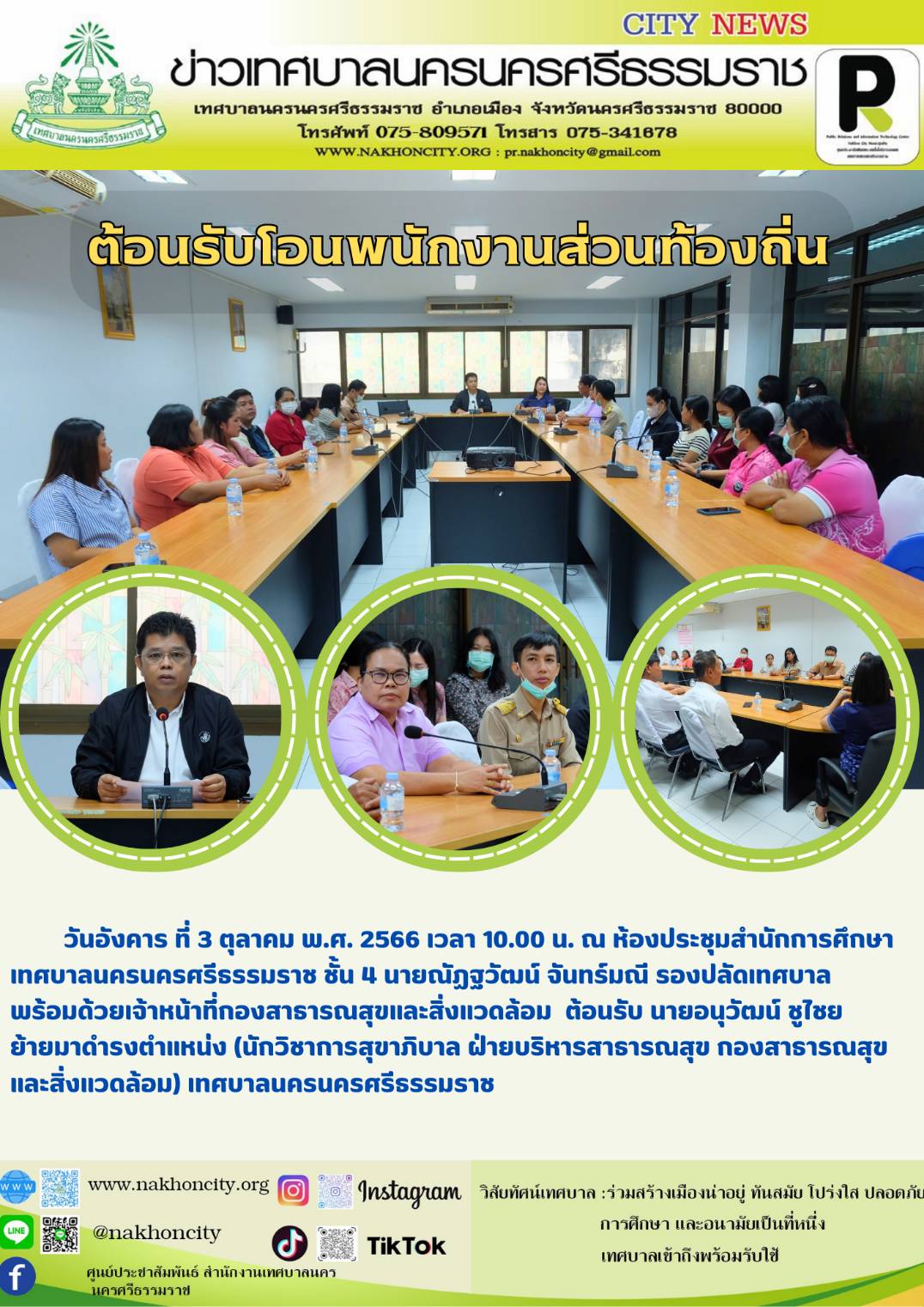 วันอังคาร ที่ 3 ตุลาคม พ.ศ. 2566 เวลา 10.00 น. ณ ห้องประชุมสำนักการศึกษา เทศบาลนครนครศรีธรรมราช ชั้น 4 นายณัฏฐวัฒน์ จันทร์มณี รองปลัดเทศบาล พร้อมด้วยเจ้าหน้าที่กองสาธารณสุขและสิ่งแวดล้อม ต้อนรับ นายอนุวัฒน์ ชูไชย ย้ายมาดำรงตำแหน่ง (นักวิชาการสุขาภิบาล ฝ่ายบริหารสาธารณสุข กองสาธารณสุขและสิ่งแวดล้อม) เทศบาลนครนครศรีธรรมราช |