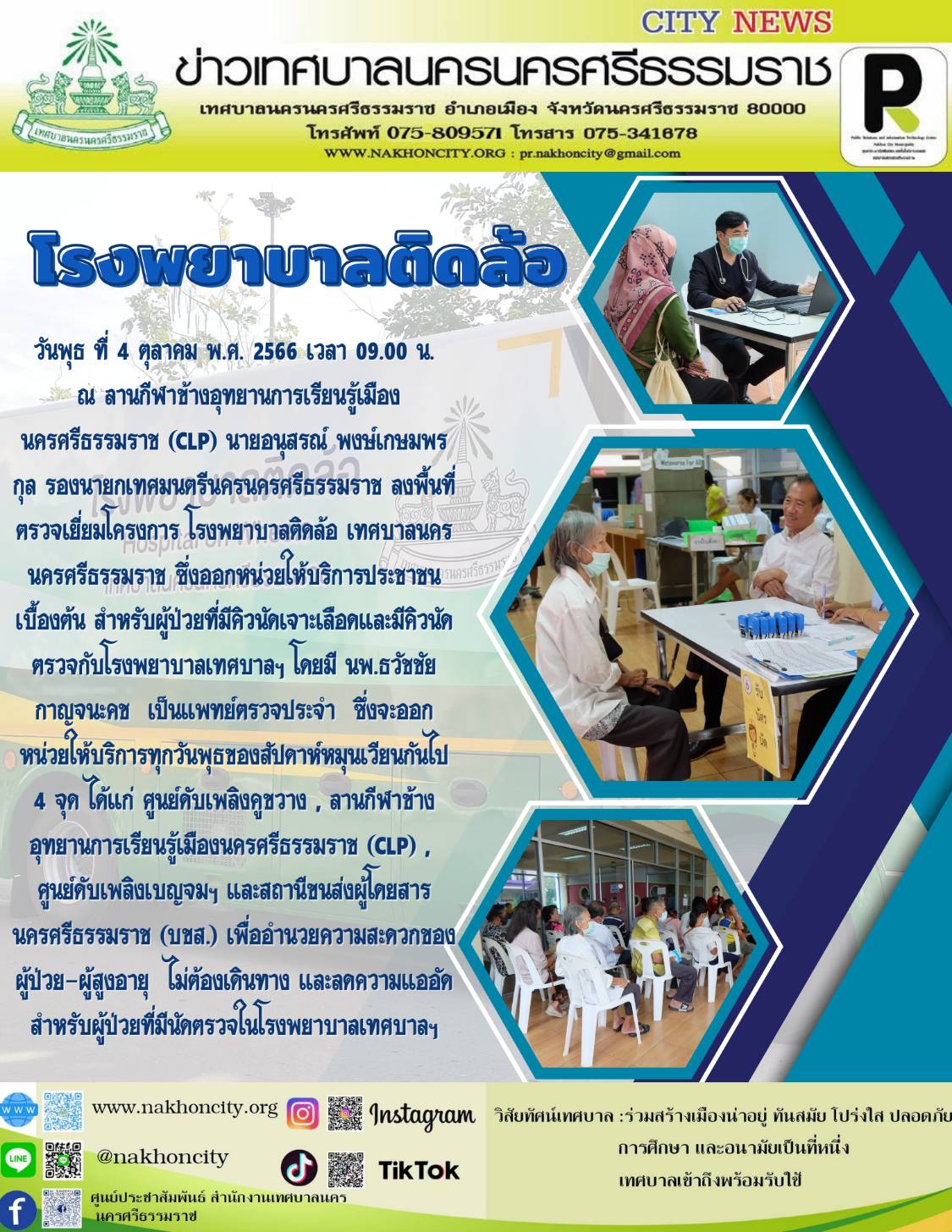 วันพุธ ที่ 4 ตุลาคม พ.ศ. 2566 เวลา 09.00 น. ณ ลานกีฬาข้างอุทยานการเรียนรู้เมืองนครศรีธรรมราช (CLP) นายอนุสรณ์ พงษ์เกษมพรกุล รองนายกเทศมนตรีนครนครศรีธรรมราช ลงพื้นที่ตรวจเยี่ยมโครงการ โรงพยาบาลติดล้อ เทศบาลนครนครศรีธรรมราช ซึ่งออกหน่วยให้บริการประชาชนเบื้องต้น สำหรับผู้ป่วยที่มีคิวนัดเจาะเลือดและมีคิวนัดตรวจกับโรงพยาบาลเทศบาลฯ โดยมี นพ.ธวัชชัย กาญจนะคช เป็นแพทย์ตรวจประจำ ซึ่งจะออกหน่วยให้บริการทุกวันพุธของสัปดาห์หมุนเวียนกันไป 4 จุด ได้แก่ ศูนย์ดับเพลิงคูขวาง , ลานกีฬาข้างอุทยานการเรียนรู้เมืองนครศรีธรรมราช (CLP) , ศูนย์ดับเพลิงเบญจมฯ และสถานีขนส่งผู้โดยสารนครศรีธรรมราช (บขส.) เพื่ออำนวยความสะดวกของผู้ป่วย-ผู้สูงอายุ ไม่ต้องเดินทาง และลดความแออัดสำหรับผู้ป่วยที่มีนัดตรวจในโรงพยาบาลเทศบาลฯ |