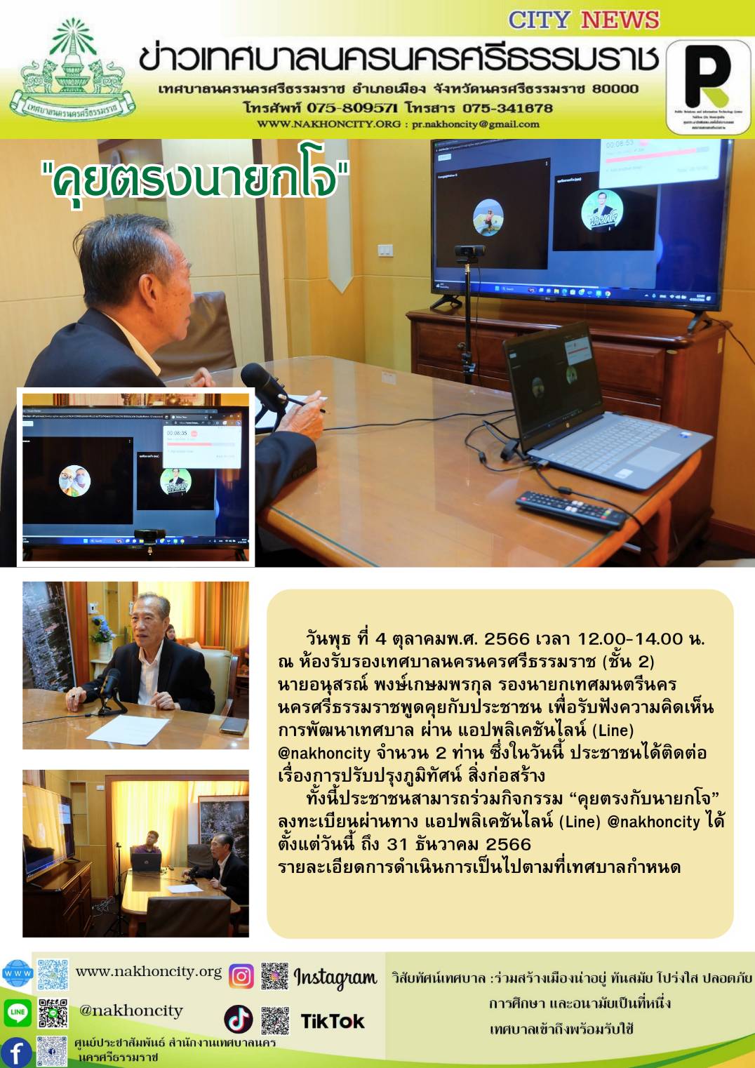 นายอนุสรณ์ พงษ์เกษมพรกุล รองนายกเทศมนตรีนครนครศรีธรรมราช พูดคุยกับประชาชน เพื่อรับฟังความคิดเห็นการพัฒนาเทศบาล ผ่าน แอปพลิเคชันไลน์ (Line) @nakhoncity |