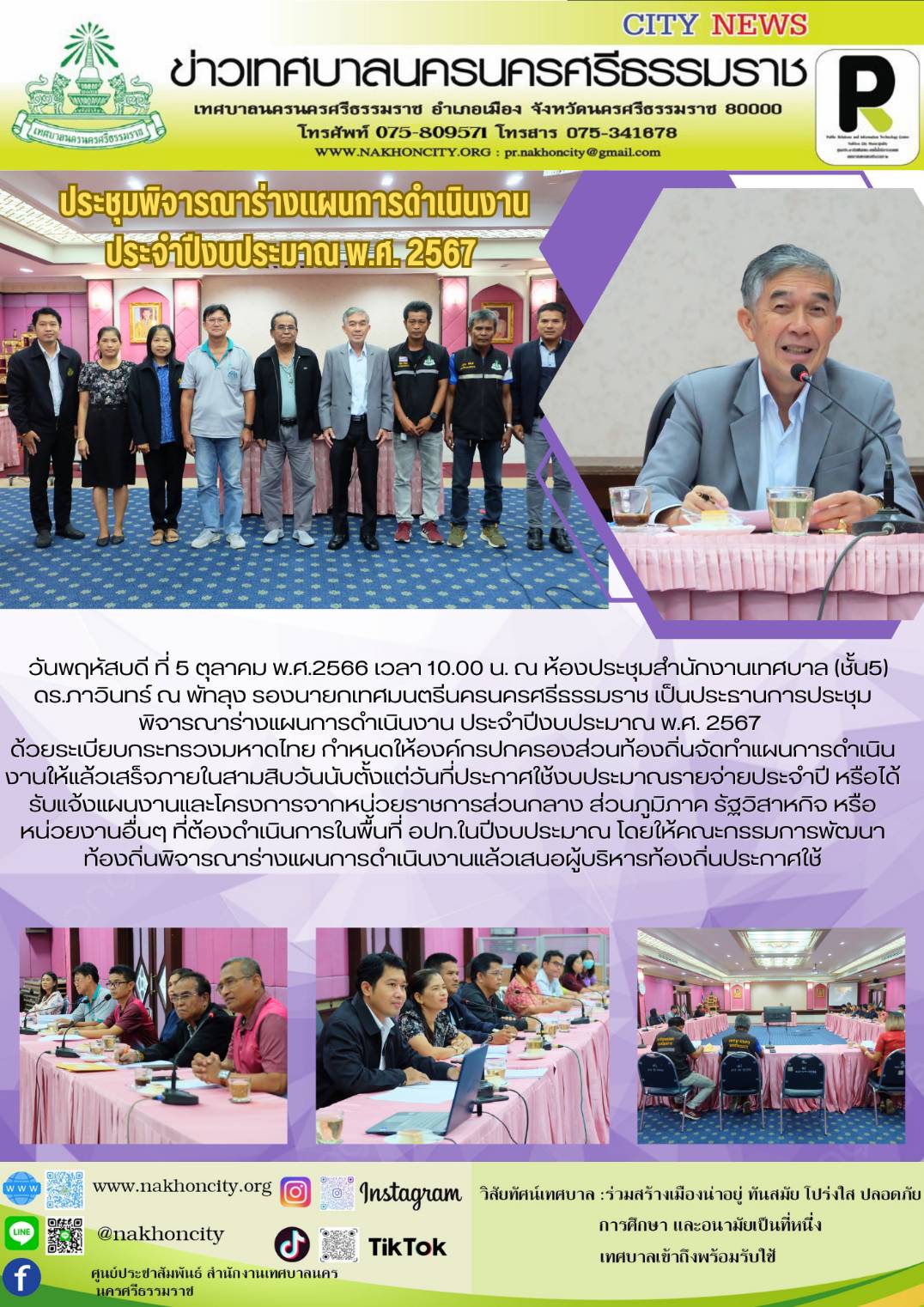 ดร.ภาวินทร์ ณ พัทลุง รองนายกเทศมนตรีนครนครศรีธรรมราช เป็นประธานการประชุมพิจารณาร่างแผนการดำเนินงาน ประจำปีงบประมาณ พ.ศ. 2567 |