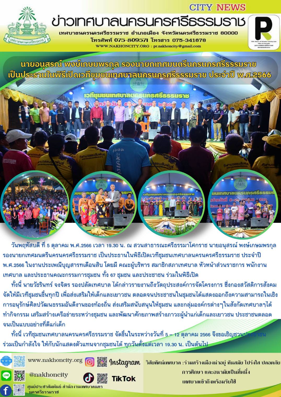 นายอนุสรณ์ พงษ์เกษมพรกุล รองนายกเทศมนตรีนครนครศรีธรรมราช เป็นประธานในพิธีเปิดเวทีชุมชนเทศบาลนครนครศรีธรรมราช ประจำปี พ.ศ.2566 |