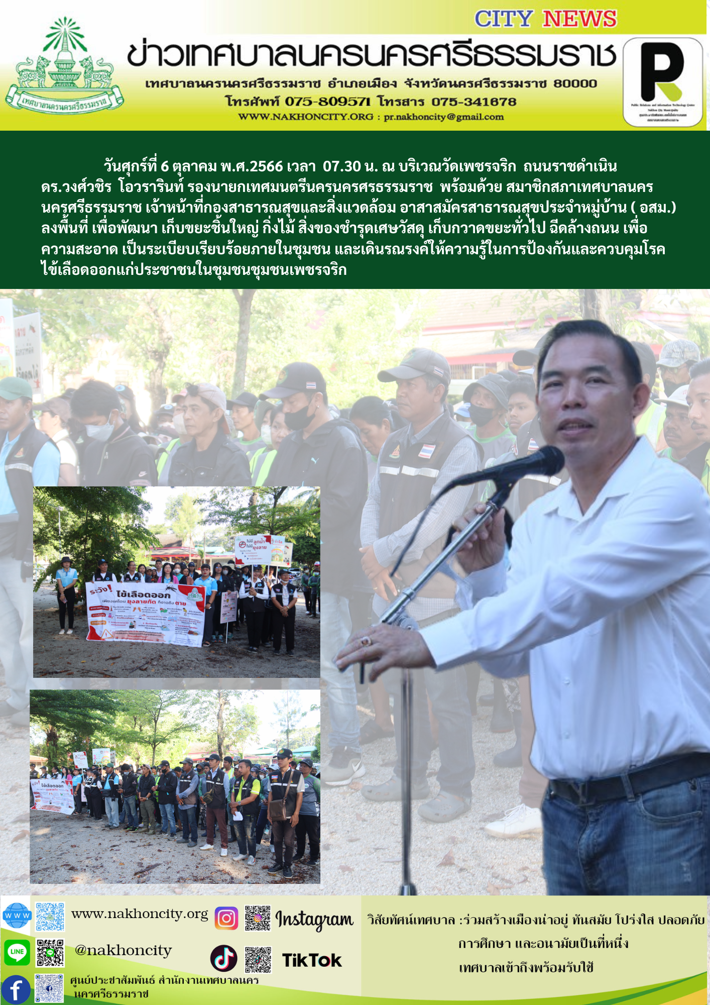 วันศุกร์ที่ 6 ตุลาคม พ.ศ.2566 เวลา 07.30 น. ณ บริเวณวัดเพชรจริก ดร.วงศ์วชิร โอวรารินท์ รองนายกเทศมนตรีนครนครศรธรรมราช พร้อมด้วย สมาชิกสภาเทศบาลนครนครศรีธรรมราช เจ้าหน้าที่กองสาธารณสุขและสิ่งแวดล้อม อาสาสมัครสาธารณสุขประจำหมู่บ้าน ( อสม.) ลงพื้นที่ เพื่อพัฒนา เก็บขยะชิ้นใหญ่ กิ่งไม้ สิ่งของชำรุดเศษวัสดุ เก็บกวาดขยะทั่วไป ฉีดล้างถนน เพื่อความสะอาด เป็นระเบียบเรียบร้อยภายในชุมชน และเดินรณรงค์ให้ความรู้ในการป้องกันและควบคุมโรคไข้เลือดออกแก่ประชาชนในชุมชนชุมชนเพชรจริก |