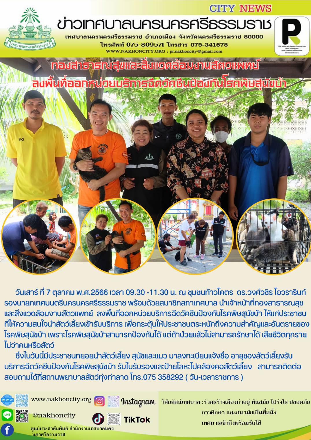 วันเสาร์ ที่ 7 ตุลาคม พ.ศ.2566 เวลา 09.30 -11.30 น. ณ ชุมชนท้าวโคตร ดร.วงศ์วชิร โอวรารินท์ รองนายกเทศมนตรีนครนครศรีธรรมราช พร้อมด้วยสมาชิกสภาเทศบาล นำเจ้าหน้าที่กองสาธารณสุขและสิ่งแวดล้อมงานสัตวแพทย์ ลงพื้นที่ออกหน่วยบริการฉีดวัคซีนป้องกันโรคพิษสุนัขบ้า ให้แก่ประชาชนที่ให้ความสนใจนำสัตว์เลี้ยงเข้ารับบริการ เพื่อกระตุ้นให้ประชาชนตระหนักถึงความสำคัญและอันตรายของโรคพิษสุนัขบ้า เพราะโรคพิษสุนัขบ้าสามารถป้องกันได้ แต่ถ้าป่วยแล้วไม่สามารถรักษาได้ เสียชีวิตทุกรายไม่ว่าคนหรือสัตว์ |
