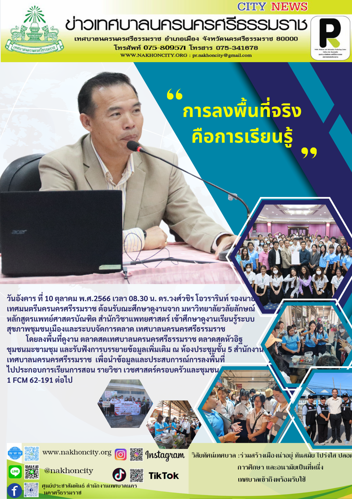 วันอังคาร ที่ 10 ตุลาคม พ.ศ.2566 เวลา 08.30 น. ดร.วงศ์วชิร โอวรารินท์ รองนายกเทศมนตรีนครนครศรีรรมราช ต้อนรับณะศึกษาดูงานจาก มหาวิทยาลัยวลัยลักษณ์ หลักสูตรแพทย์ศาสตรบัณฑิต สำนักวิชาแพทยศาสตร์ เข้าศึกษาดูงานเรียนรู้ระบบสุขภาพชุมชนเมืองและระบบจัดการตลาด เทศบาลนครนครศรีธรรมราช โดยลงพื้นที่ดูงาน ตลาดสดเทศบาลนครนครศรีธรรมราช ตลาดสดหัวอิฐ ชุมชนมะขามชุม และรับฟังการบรรยายข้อมูลเพิ่มเติม ณ ห้องประชุมชั้น 5 สำนักงานเทศบาลนครนครศรีรรมราช เพื่อนำข้อมูลและประสบการณ์การลงพื้นที่ ไปประกอบการเรียนการสอน รายวิชา เวชศาสตร์ครอบครัวและชุมชน 1 FCM 62-191 ต่อไป |