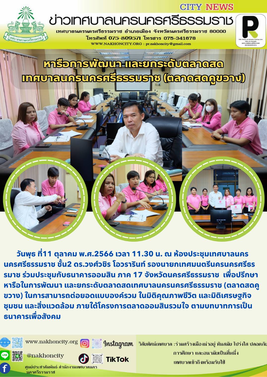 วันพุธ ที่11 ตุลาคม พ.ศ.2566 เวลา 11.30 น. ณ ห้องประชุมเทศบาลนครนครศรีธรรมราช ชั้น2 ดร.วงศ์วชิร โอวรารินท์ รองนายกเทศมนตรีนครนครศรีธรรมาช ร่วมประชุมกับธนาคารออมสิน ภาค 17 จังหวัดนครศรีธรรมราช เพื่อปรึกษาหารือในการพัฒนา และยกระดับตลาดสดเทศบาลนครนครศรีธรรมราช (ตลาดสดคูขวาง) ในการสามารถต่อยอดแบบองค์รวม ในมิติคุณภาพชีวิต และมิติเศรษฐกิจ ชุมชน และสิ่งแวดล้อม ภายใต้โครงการตลาดออมสินรวมใจ ตามบทบาทการเป็นธนาคารเพื่อสังคม …………. ภาพ//ข่าว//จันทร์จิรา |