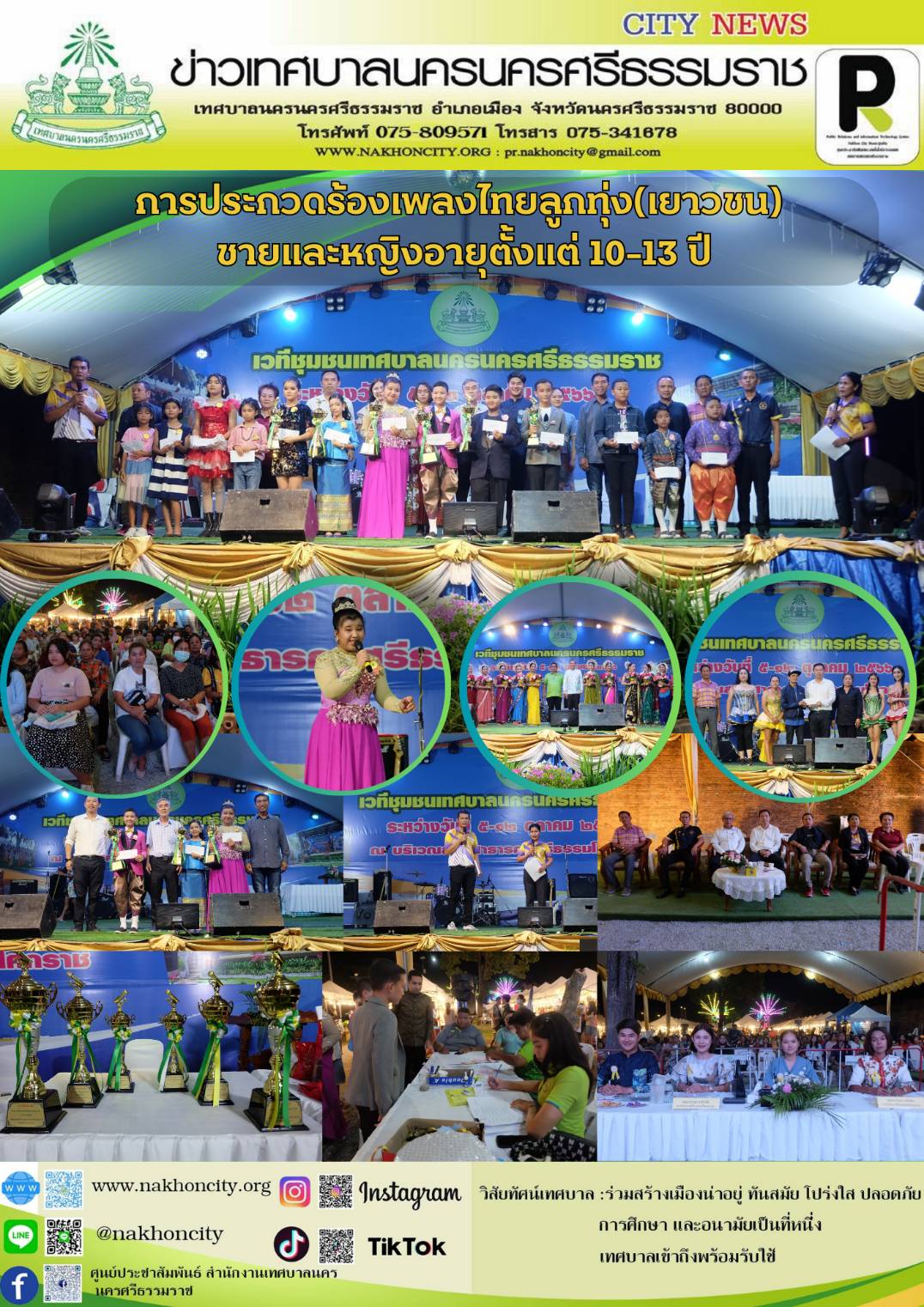 วันพุธ ที่ 11 ตุลาคม พ.ศ.2566 เวลา 19.30 น. ณ สวนสาธารณะศรีธรรมาโศกราช เทศบาลนครนครศรีธรรมราช จัดกิจกรรมเวทีชุมชนเทศบาลนครนครศรีธรรมราช ประจำปี พ.ศ.2566 ในงานประเพณีบุญสารทเดือนสิบ เพื่อส่งเสริมให้เด็กและเยาวชน ตลอดจนประชาชนในชุมชนได้แสดงออกถึงความสามารถในเชิงการอนุรักษ์ศิลปวัฒนธรรมอันดีงานของท้องถิ่น ส่งเสริมสนับสนุนให้ชุมชน และกลุ่มองค์กรต่างๆในสังกัดเทศบาลฯได้ทำกิจกรรม เสริมสร้างเครือข่ายระหว่างชุมชน และพัฒนาศักยภาพสร้างภาวะผู้นำแก่เด็กและเยาวชน ประชาชนตลอดจนเป็นแบบอย่างที่ดีแก่เด็ก สำหรับในคืนนี้เป็นการประกวดร้องเพลงไทยลูกทุ่ง(เยาวชน) ประเภทชายและหญิง อายุตั้งแต่ 10 -13 ปี ผลการประกวดร้องเพลงไทยลูกทุ่ง (เยาวชนหญิง) ได้แก่