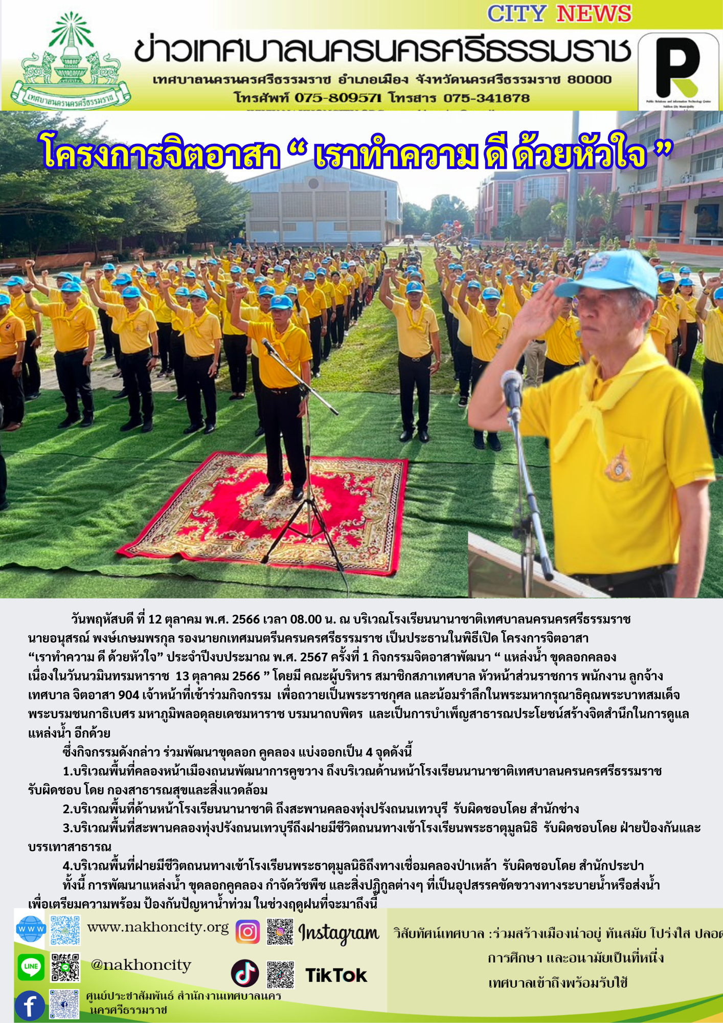 นายอนุสรณ์ พงษ์เกษมพรกุล รองนายกเทศมนตรีนครนครศรีธรรมราช เป็นประธานในพิธีเปิด โครงการจิตอาสา “เราทำความ ดี ด้วยหัวใจ” ประจำปีงบประมาณ พ.ศ. 2567 ครั้งที่ 1 กิจกรรมจิตอาสาพัฒนา “ แหล่งน้ำ ขุดลอกคลอง เนื่องในวันนวมินทรมหาราช 13 ตุลาคม 2566 ” |