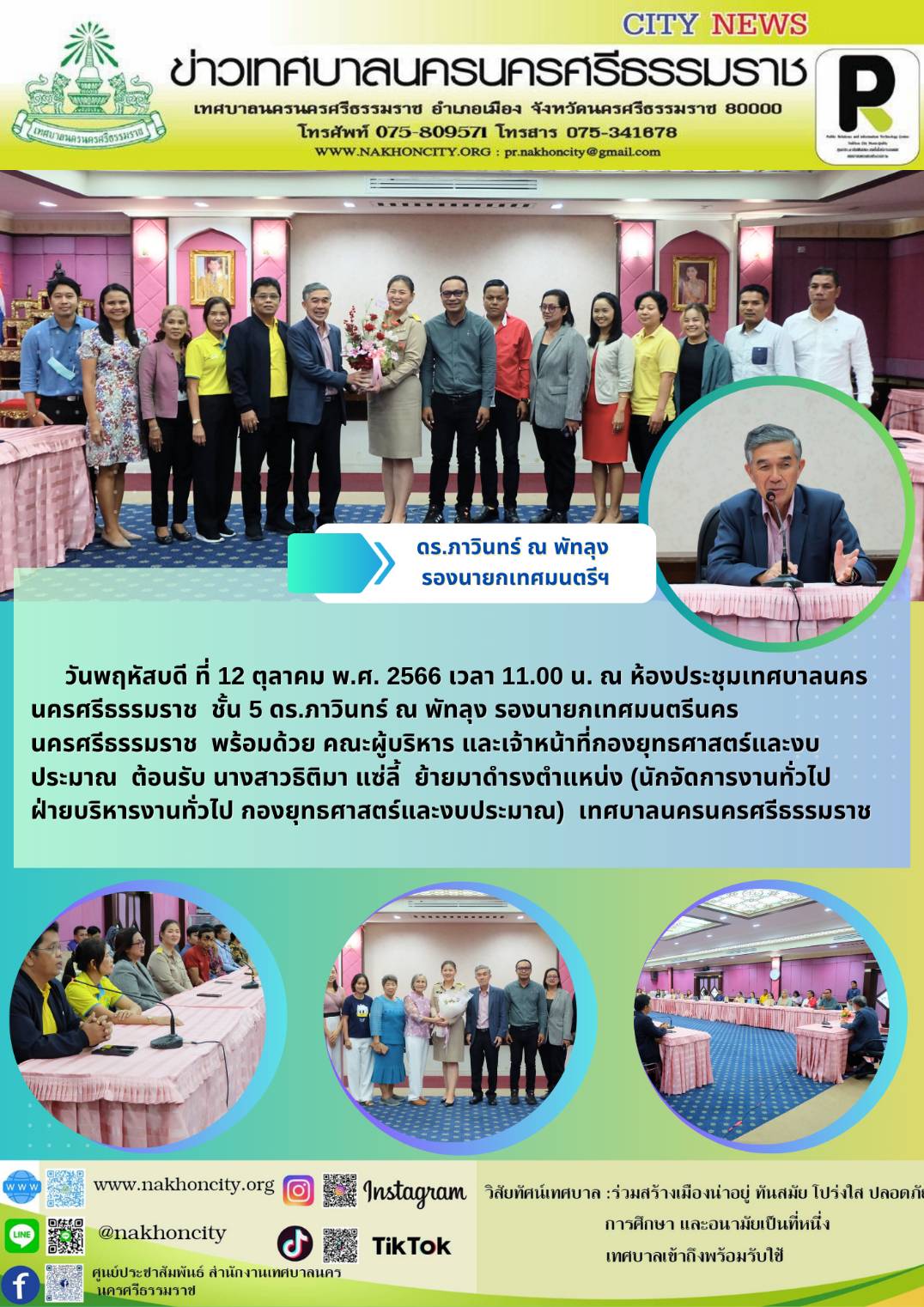 ดร.ภาวินทร์ ณ พัทลุง รองนายกเทศมนตรีนครนครศรีธรรมราช พร้อมด้วย คณะผู้บริหาร และเจ้าหน้าที่กองยุทธศาสตร์และงบประมาณ ต้อนรับข้าราชการโอนย้าย |