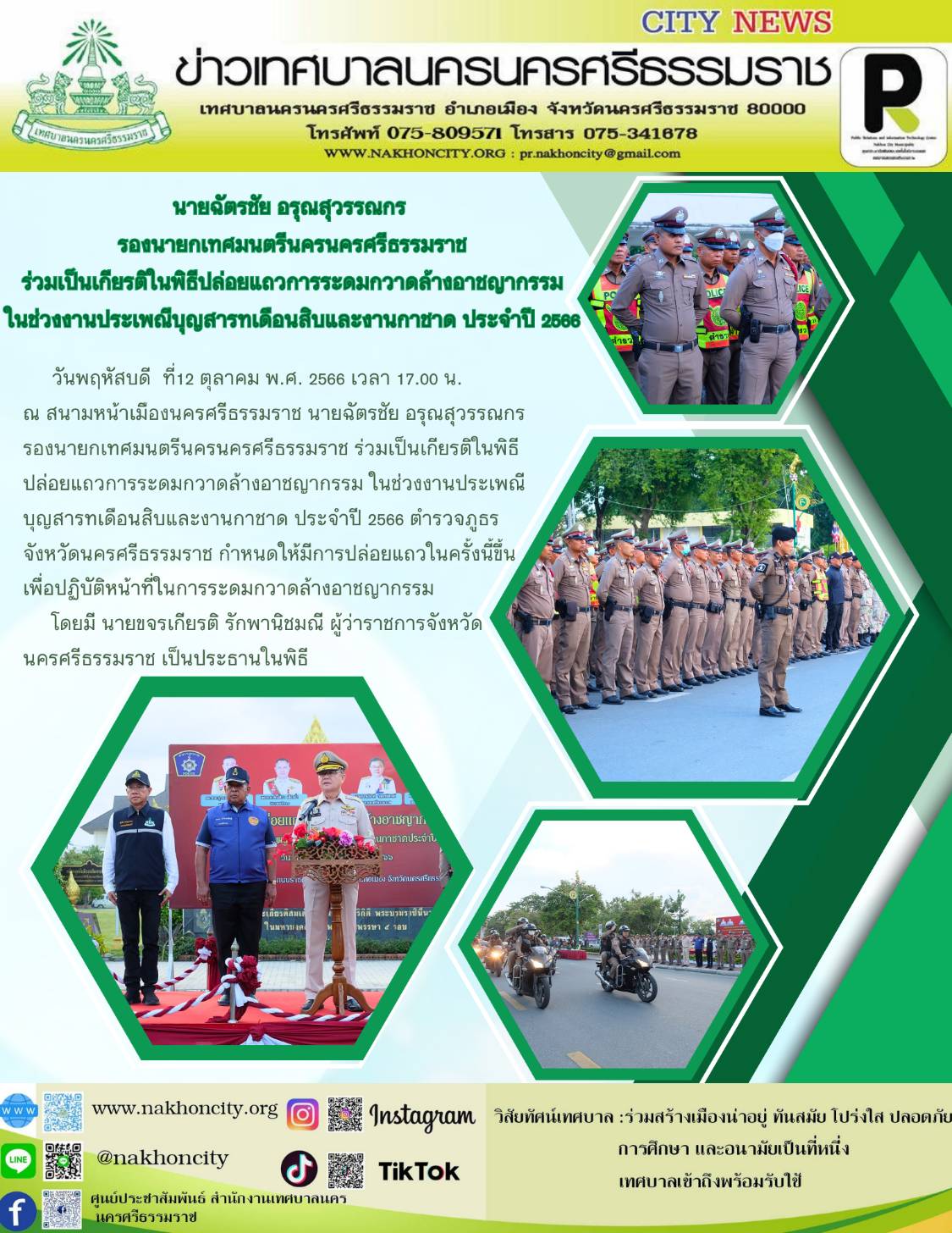 นายฉัตรชัย อรุณสุวรรณกร รองนายกเทศมนตรีนครนครศรีธรรมราช ร่วมเป็นเกียรติในพิธีปล่อยแถวการระดมกวาดล้างอาชญากรรม ในช่วงงานประเพณีบุญสารทเดือนสิบและงานกาชาด ประจำปี 2566 |