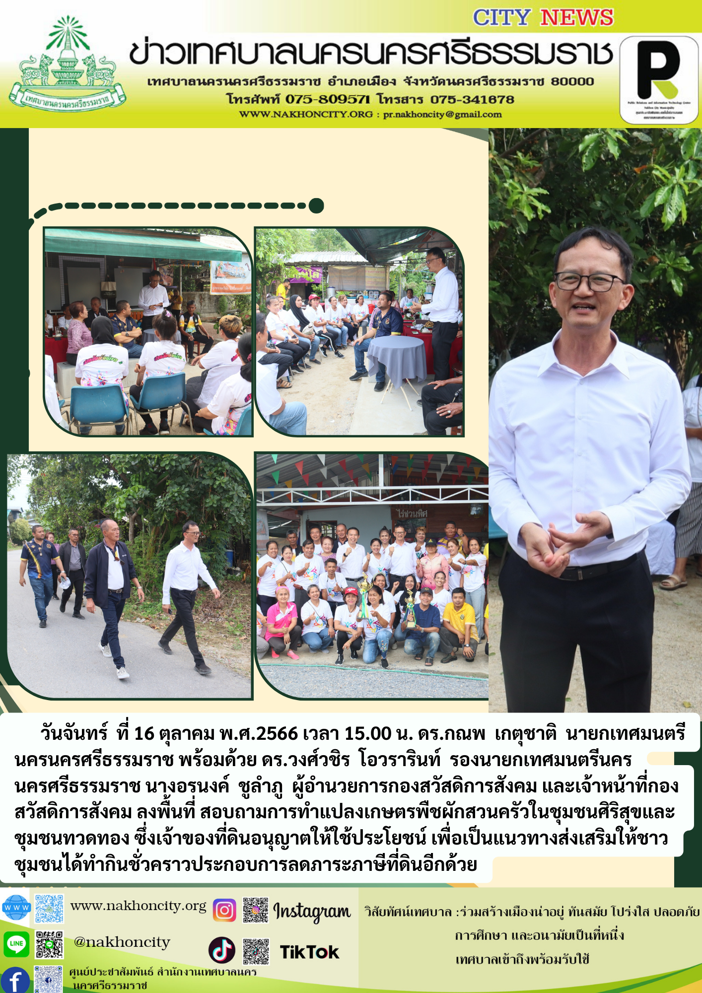 ดร.กณพ เกตุชาติ นายกเทศมนตรีนครนครศรีธรรมราช พร้อมด้วย ดร.วงศ์วชิร โอวรารินท์ รองนายกเทศมนตรีนครนครศรีธรรมราช นางอรนงค์ ชูลำภู ผู้อำนวยการกองสวัสดิการสังคม และเจ้าหน้าที่กองสวัสดิการสังคม ลงพื้นที่ สอบถามการทำแปลงเกษตรพืชผักสวนครัวในชุมชนศิริสุขและชุมชนทวดทอง |