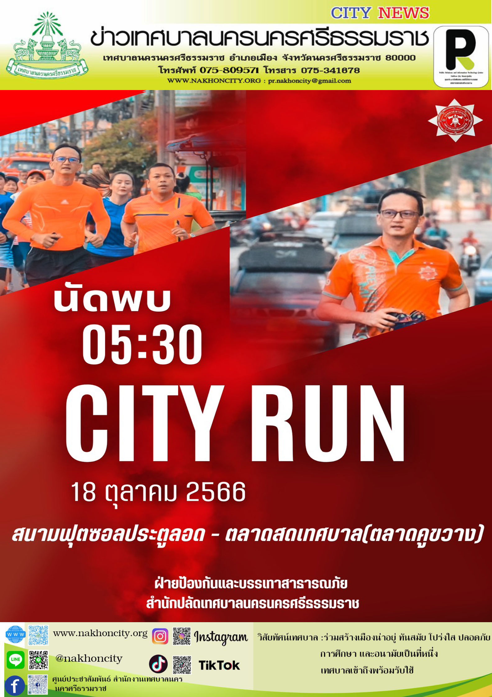 เทศบาลนครนครศรีธรรมราช ภายใต้การนำ ดร.กณพ เกตุชาติ นายกเทศมนตรีนครนครศรีธรรมราช เชิญชวนประชาชน ร่วมวิ่งออกกำลังกาย ทุกเช้าวันพุธ เวลา 05.30 น.เป็นต้นไป กับกิจกรรม "City Run" พร้อมกับ เจ้าหน้าฝ่ายป้องกันและบรรเทาสาธารณภัย และบุคลากร ของ เทศบาลนครนครศรีธรรมราช ซึ่งใน วันพุธที่ 18 ตุลาคม 2566 นี้ ขอเชิญชวนผู้ที่จะเข้าร่วมกิจกรรมทุกท่าน พบกันที่ สนามฟุตซอลประตูลอด เริ่มวิ่งจากสนาม ไปถึงสามแยกประตูลอด เลี้ยวซ้ายไปตามถนนพัฒนาการคูขวาง วิ่งมาถึงสี่แยกปากนคร เลี้ยวซ้ายผ่านหน้าตลาดสดเทศบาล ถึงสี่แยกสหไทย เลี้ยวซ้ายวิ่งไปตามถนนศรีปราชญ์ จนมาถึงสนามฟุตซอล เพื่อสร้างสุขภาพร่างกายที่ดี ไปด้วยกันกับเทศบาลนครนครศรีธรรมราช