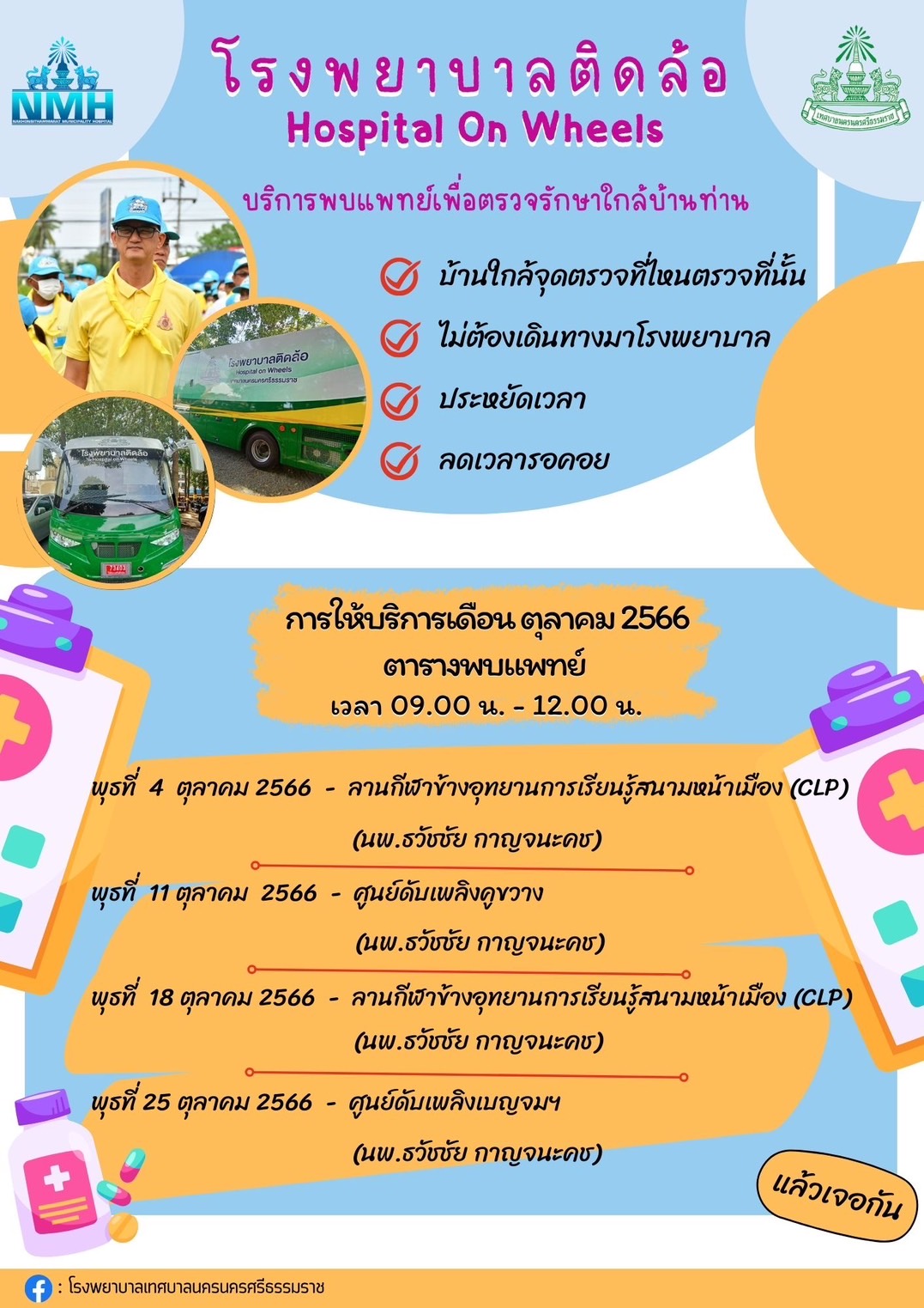 เทศบาลนครนครศรีธรรมราช โดยโรงพยาบาลเทศบาลนครนครศรีธรรมราช กองการแพทย์ ดำเนินโครงการโรงพยาบาลติดล้อหมอถึงหน้าบ้าน ซึ่งในเดือนตุลาคม 2566 มีกำหนดลงพื้นที่บริการให้บริการดังนี้ ข่าว//ไกรสิทธิ |