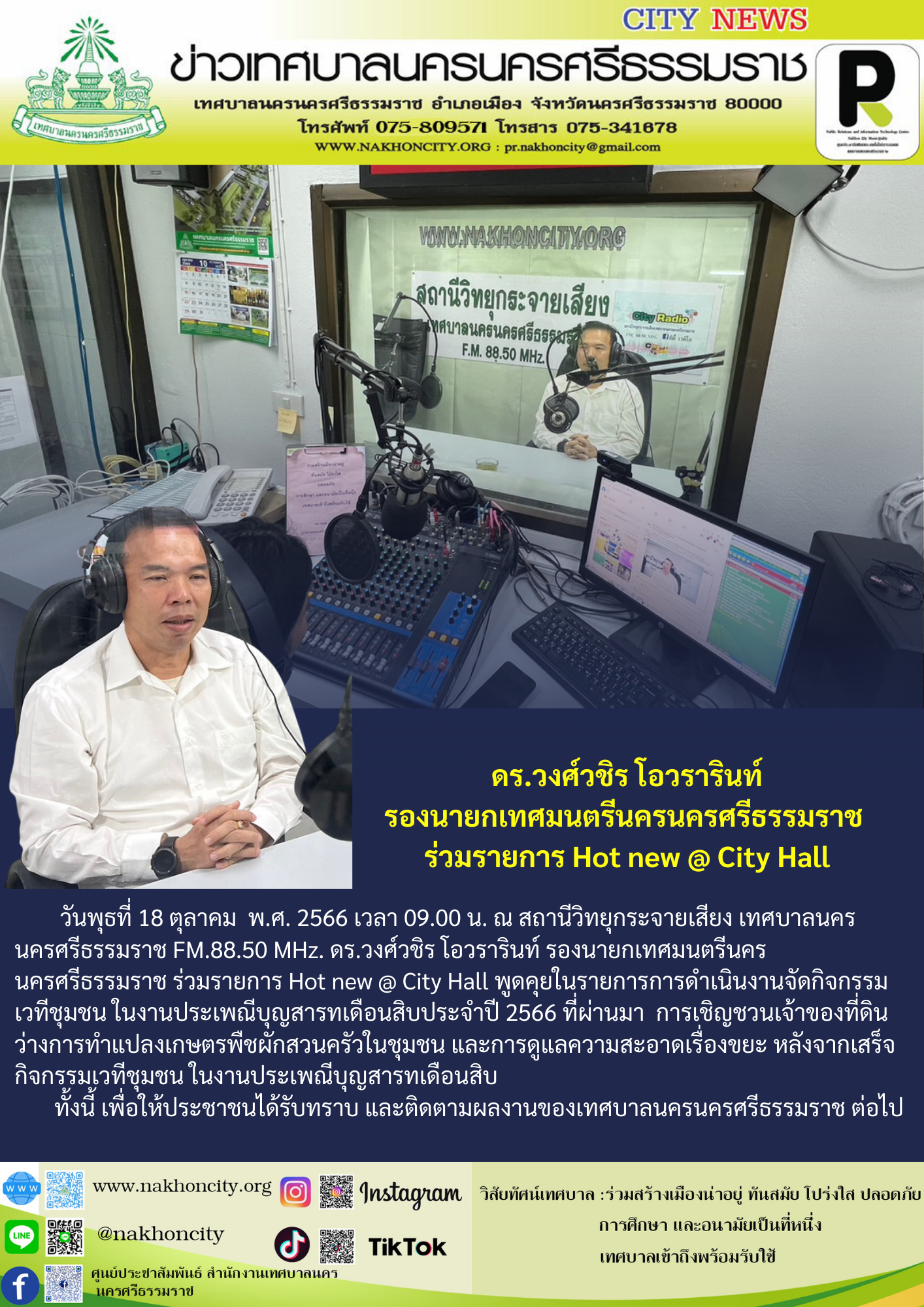 วันพุธที่ 18 ตุลาคม พ.ศ. 2566 เวลา 09.00 น. ณ สถานีวิทยุกระจายเสียง เทศบาลนครนครศรีธรรมราช FM.88.50 MHz. ดร.วงศ์วชิร โอวรารินท์ รองนายกเทศมนตรีนครนครศรีธรรมราช ร่วมรายการ Hot new @ City Hall พูดคุยในรายการการดำเนินงานจัดกิจกรรมเวทีชุมชน ในงานประเพณีบุญสารทเดือนสิบประจำปี 2566 ที่ผ่านมา การเชิญชวนเจ้าของที่ดินว่างการทำแปลงเกษตรพืชผักสวนครัวในชุมชน และการดูแลความสะอาดเรื่องขยะ หลังจากเสร็จกิจกรรมเวทีชุมชน ในงานประเพณีบุญสารทเดือนสิบ ทั้งนี้ เพื่อให้ประชาชนได้รับทราบ และติดตามผลงานของเทศบาลนครนครศรีธรรมราช ต่อไป |