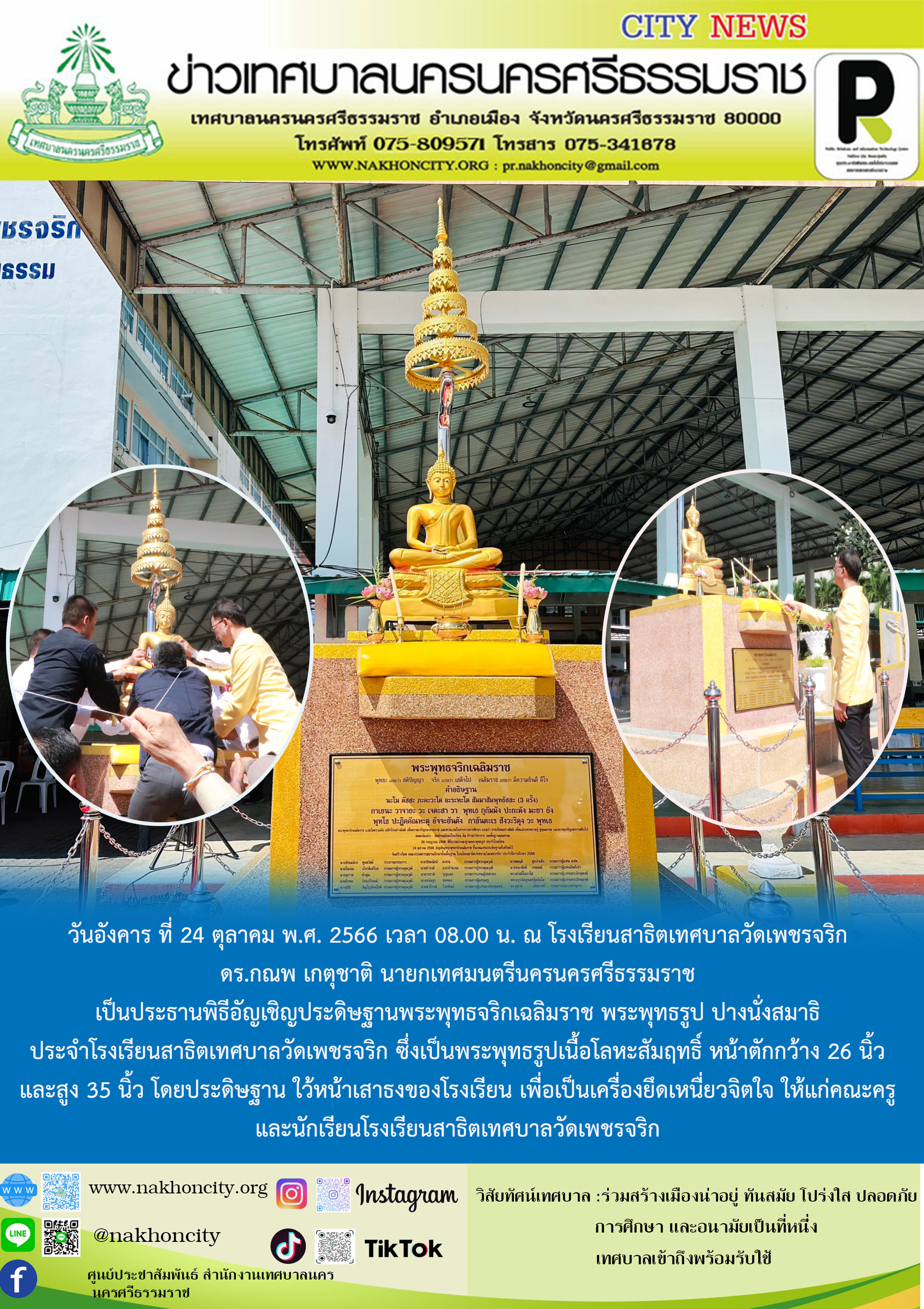 ดร.กณพ เกตุชาติ นายกเทศมนตรีนครนครศรีธรรมราชเป็นประธานพิธีอัญเชิญประดิษฐานพระพุทธจริกเฉลิมราช พระพุทธรูป ปางนั่งสมาธิ ประจำโรงเรียนสาธิตเทศบาลวัดเพชรจริก ซึ่งเป็นพระพุทธรูปเนื้อโลหะสัมฤทธิ์ หน้าตักกว้าง 26 นิ้ว และสูง 35 นิ้ว โดยประดิษฐาน ใว้หน้าเสาธงของโรงเรียน |