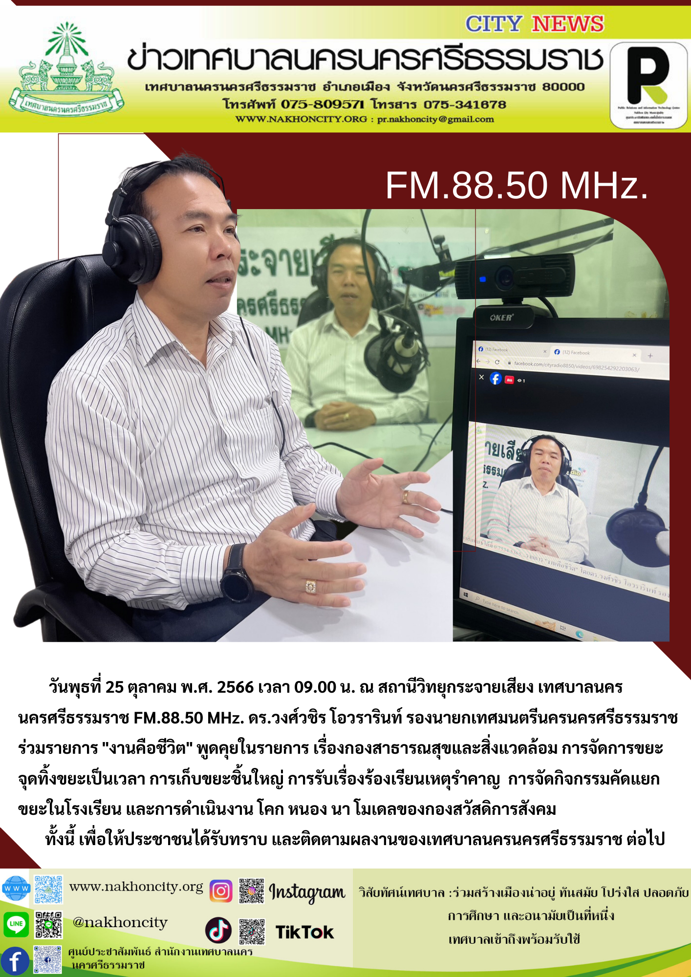 วันพุธที่ 25 ตุลาคม พ.ศ. 2566 เวลา 09.00 น. ณ สถานีวิทยุกระจายเสียง เทศบาลนครนครศรีธรรมราช FM.88.50 MHz. ดร.วงศ์วชิร โอวรารินท์ รองนายกเทศมนตรีนครนครศรีธรรมราช ร่วมรายการ "งานคือชีวิต" พูดคุยในรายการ เรื่องกองสาธารณสุขและสิ่งแวดล้อม การจัดการขยะ จุดทิ้งขยะเป็นเวลา การเก็บขยะชิ้นใหญ่ การรับเรื่องร้องเรียนเหตุรำคาญ การจัดกิจกรรมคัดแยกขยะในโรงเรียน และการดำเนินงาน โคก หนอง นา โมเดลของกองสวัสดิการสังคม ทั้งนี้ เพื่อให้ประชาชนได้รับทราบ และติดตามผลงานของเทศบาลนครนครศรีธรรมราช ต่อไป