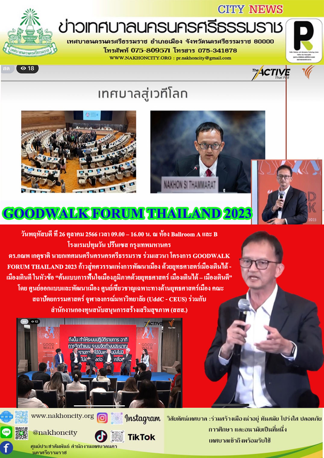 ดร.กณพ เกตุชาติ นายกเทศมนตรีนครนครศรีธรรมราช ร่วมเสวนา โครงการ GOODWALK FORUM THAILAND 2023 ก้าวสู่ทศวรรษแห่งการพัฒนาเมือง ด้วยยุทธศาสตร์เมืองเดินได้ - เมืองเดินดี |