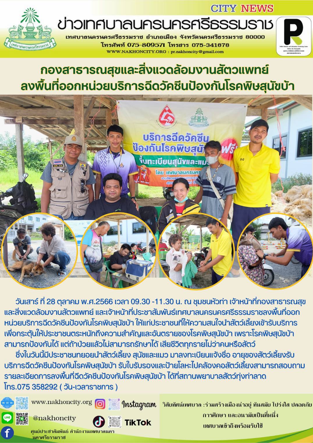 เจ้าหน้าที่กองสาธารณสุขและสิ่งแวดล้อมงานสัตวแพทย์ และเจ้าหน้าที่ประชาสัมพันธ์เทศบาลนครนครศรีธรรมราช ลงพื้นที่ออกหน่วยบริการฉีดวัคซีนป้องกันโรคพิษสุนัขบ้า |