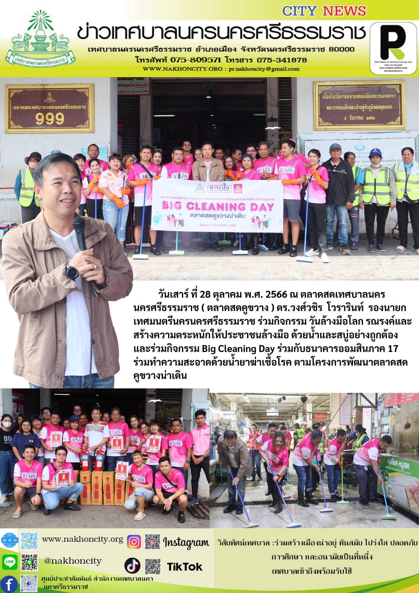 วันเสาร์ ที่ 28 ตุลาคม พ.ศ. 2566 ณ ตลาดสดเทศบาลนครนครศรีธรรมราช ( ตลาดสดคูขวาง ) ดร.วงศ์วชิร โวรารินท์ รองนายกเทศมนตรีนครนครศรีธรรมราช ร่วมกิจกรรม วันล้างมือโลก รณรงค์และสร้างความตระหนักให้ประชาชนล้างมือ ด้วยน้ำและสบู่อย่างถูกต้อง และร่วมกิจกรรม Big Cleaning Day ร่วมกับธนาคารออมสินภาค 17 ร่วมทำความสะอาดด้วยน้ำยาฆ่าเชื้อโรค ตามโครงการพัฒนาตลาดสดคูขวางน่าเดิน |