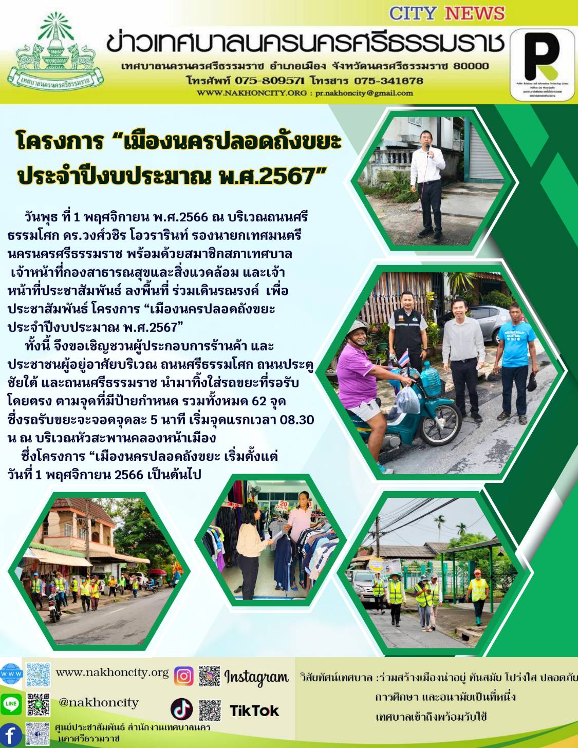 วันพุธ ที่ 1 พฤศจิกายน พ.ศ.2566 ณ บริเวณถนนศรีธรรมโศก ดร.วงศ์วชิร โอวรารินท์ รองนายกเทศมนตรีนครนครศรีธรรมราช พร้อมด้วยสมาชิกสภาเทศบาล เจ้าหน้าที่กองสาธารณสุขและสิ่งแวดล้อม และเจ้าหน้าที่ประชาสัมพันธ์ ลงพื้นที่ ร่วมเดินรณรงค์ เพื่อประชาสัมพันธ์ โครงการ “เมืองนครปลอดถังขยะ ประจำปีงบประมาณ พ.ศ.2567” ทั้งนี้ จึงขอเชิญชวนผู้ประกอบการร้านค้า และประชาชนผู้อยู่อาศัยบริเวณ ถนนศรีธรรมโศก ถนนประตูชัยใต้ และถนนศรีธรรมราช นำมาทิ้งใส่รถขยะที่รอรับโดยตรง ตามจุดที่มีป้ายกำหนด รวมทั้งหมด 62 จุด ซึ่งรถรับขยะจะจอดจุดละ 5 นาที เริ่มจุดแรกเวลา 08.30 น ณ บริเวณหัวสะพานคลองหน้าเมือง ซึ่งโครงการ “เมืองนครปลอดถังขยะ เริ่มตั้งแต่วันที่ 1 พฤศจิกายน 2566 เป็นต้นไป ............ ข่าว//จันทร์จิรา ตรวจทาน//ฐิตินันท์ |
