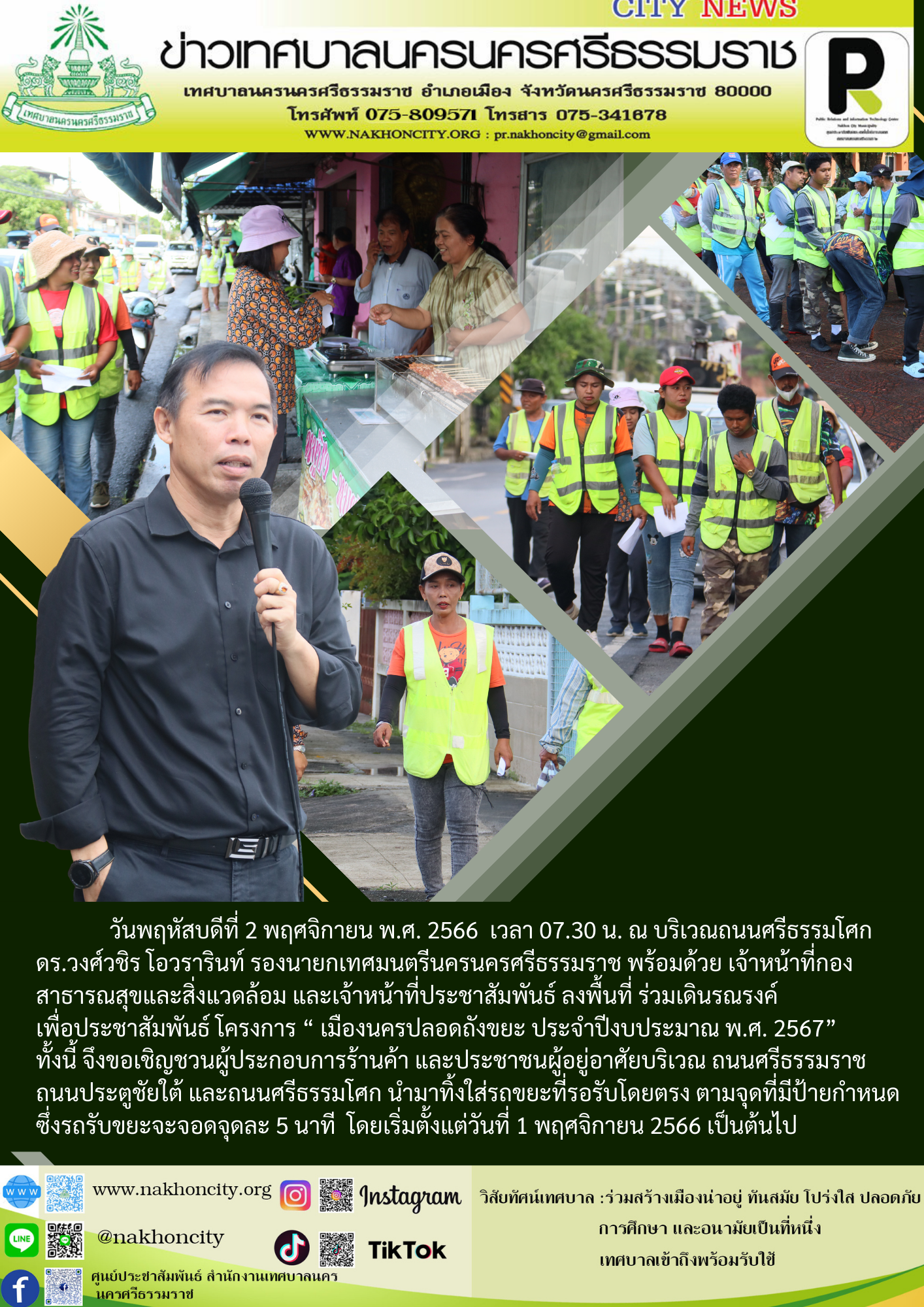 ดร.วงศ์วชิร โอวรารินท์ รองนายกเทศมนตรีนครนครศรีธรรมราช พร้อมด้วย เจ้าหน้าที่กองสาธารณสุขและสิ่งแวดล้อม และเจ้าหน้าที่ประชาสัมพันธ์ ลงพื้นที่ ร่วมเดินรณรงค์ เพื่อประชาสัมพันธ์ โครงการ “ เมืองนครปลอดถังขยะ ประจำปีงบประมาณ พ.ศ. 2567” |