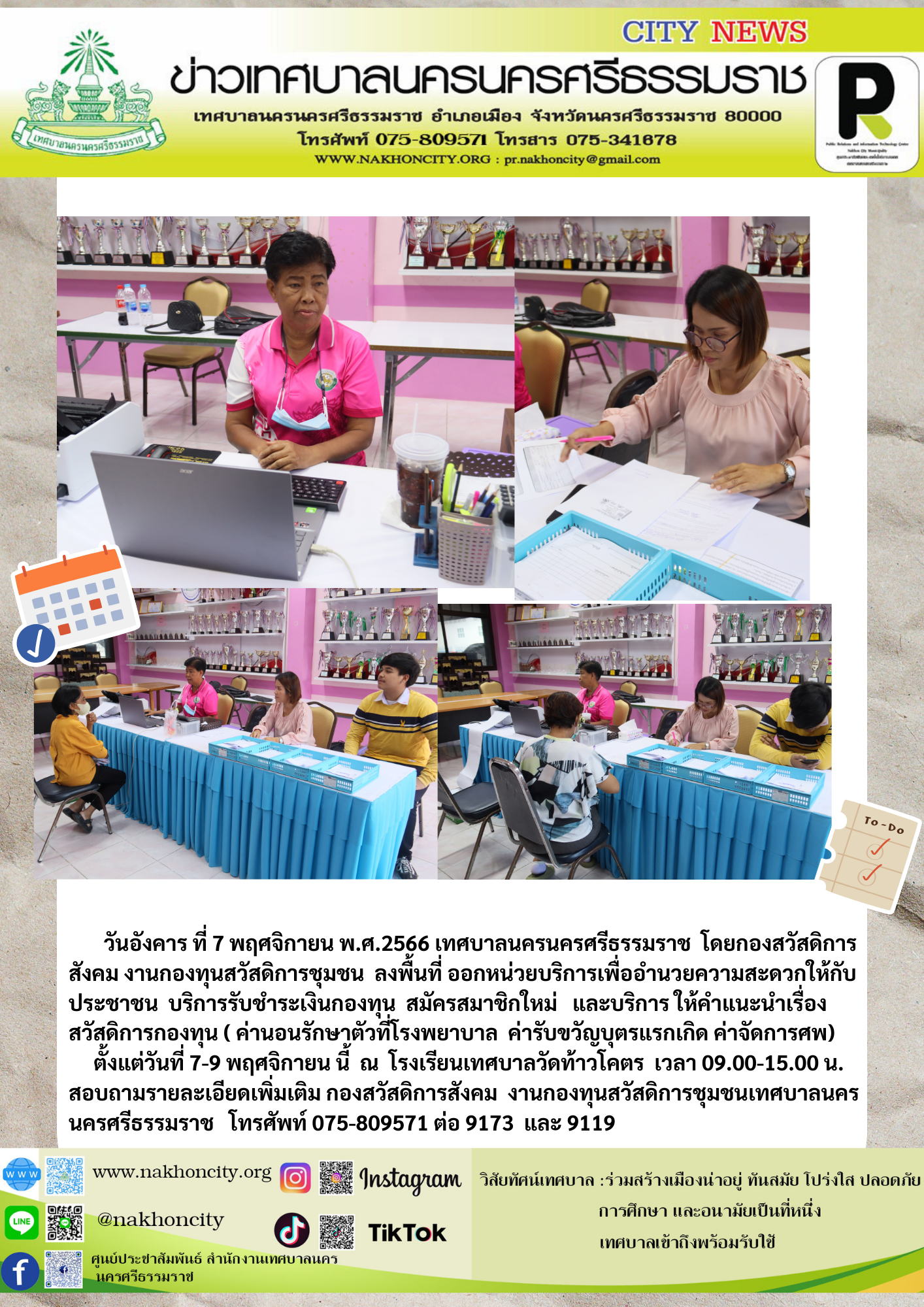 วัน อังคาร ที่ 7 พฤศจิกายน พ.ศ.2566 เทศบาลนครนครศรีธรรมราช โดยกองสวัสดิการสังคม งานกองทุนสวัสดิการชุมชน ลงพื้นที่ ออกหน่วยบริการเพื่ออำนวยความสะดวกให้กับประชาชน บริการรับชำระเงินกองทุน สมัครสมาชิกใหม่ และบริการ ให้คำแนะนำเรื่องสวัสดิการกองทุน ( ค่านอนรักษาตัวที่โรงพยาบาล ค่ารับขวัญบุตรแรกเกิด ค่าจัดการศพ) ตั้งแต่วันที่ 7-9 พฤศจิกายน นี้ ณ โรงเรียนเทศบาลวัดท้าวโคตร เวลา 09.00-15.00 น. สอบถามรายละเอียดเพิ่มเติม กองสวัสดิการสังคม งานกองทุนสวัสดิการชุมชนเทศบาลนครนครศรีธรรมราช โทรศัพท์ 075-809571 ต่อ 9173 และ 9119 |