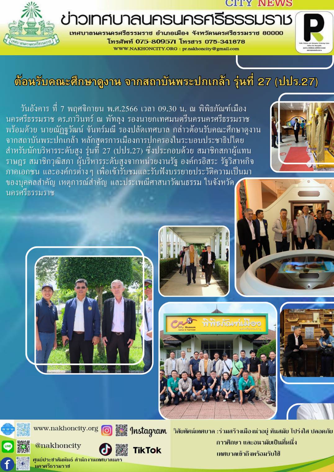 วันอังคาร ที่ 7 พฤศจิกายน พ.ศ.2566 เวลา 09.30 น. ณ พิพิธภัณฑ์เมืองนครศรีธรรมราช ดร.ภาวินทร์ ณ พัทลุง รองนายกเทศมนตรีนครนครศรีธรรมราช พร้อมด้วย นายณัฏฐวัฒน์ จันทร์มณี รองปลัดเทศบาล กล่าวต้อนรับคณะศึกษาดูงาน จากสถาบันพระปกเกล้า หลักสูตรการเมืองการปกครองในระบอบประชาธิปไตยสำหรับนักบริหารระดับสูง รุ่นที่ 27 (ปปร.27) ซึ่งประกอบด้วย สมาชิกสภาผู้แทนราษฎร สมาชิกวุฒิสภา ผู้บริหารระดับสูงจากหน่วยงานรัฐ องค์กรอิสระ รัฐวิสาหกิจ ภาคเอกชน และองค์กรต่างๆ เพื่อเข้ารับชมและรับฟังบรรยายประวัติความเป็นมาของบุคคลสำคัญ เหตุการณ์สำคัญ และประเพณีศาสนาวัฒนธรรม ในจังหวัดนครศรีธรรมราช