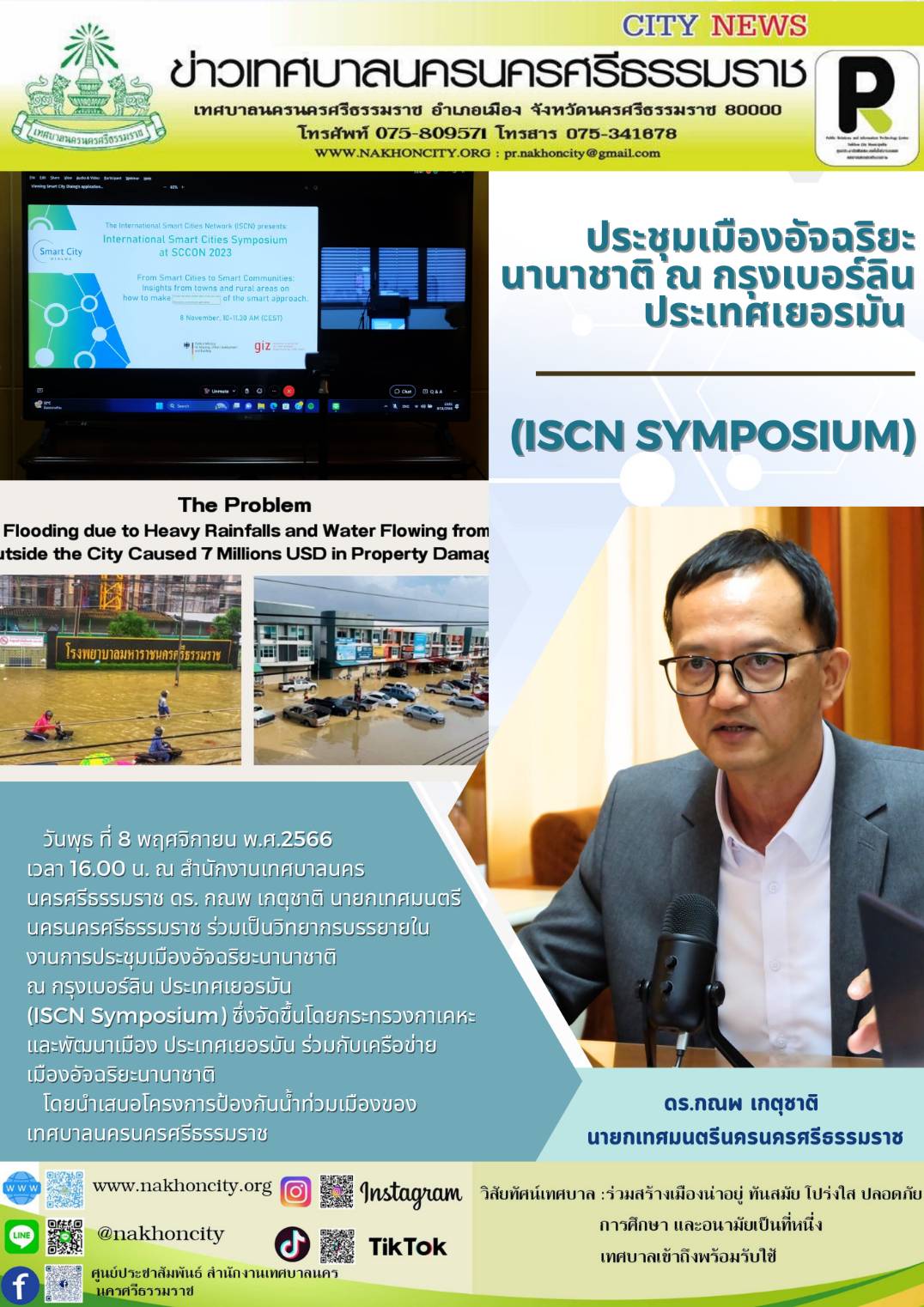วันพุธ ที่ 8 พฤศจิกายน พ.ศ.2566 เวลา 16.00 น. ณ สำนักงานเทศบาลนครนครศรีธรรมราช ดร. กณพ เกตุชาติ นายกเทศมนตรีนครนครศรีธรรมราช ร่วมเป็นวิทยากรบรรยายในงานการประชุมเมืองอัจฉริยะนานาชาติ ณ กรุงเบอร์ลิน ประเทศเยอรมัน (ISCN Symposium) ซึ่งจัดขึ้นโดยกระทรวงการเคหะและพัฒนาเมือง ประเทศเยอรมัน |