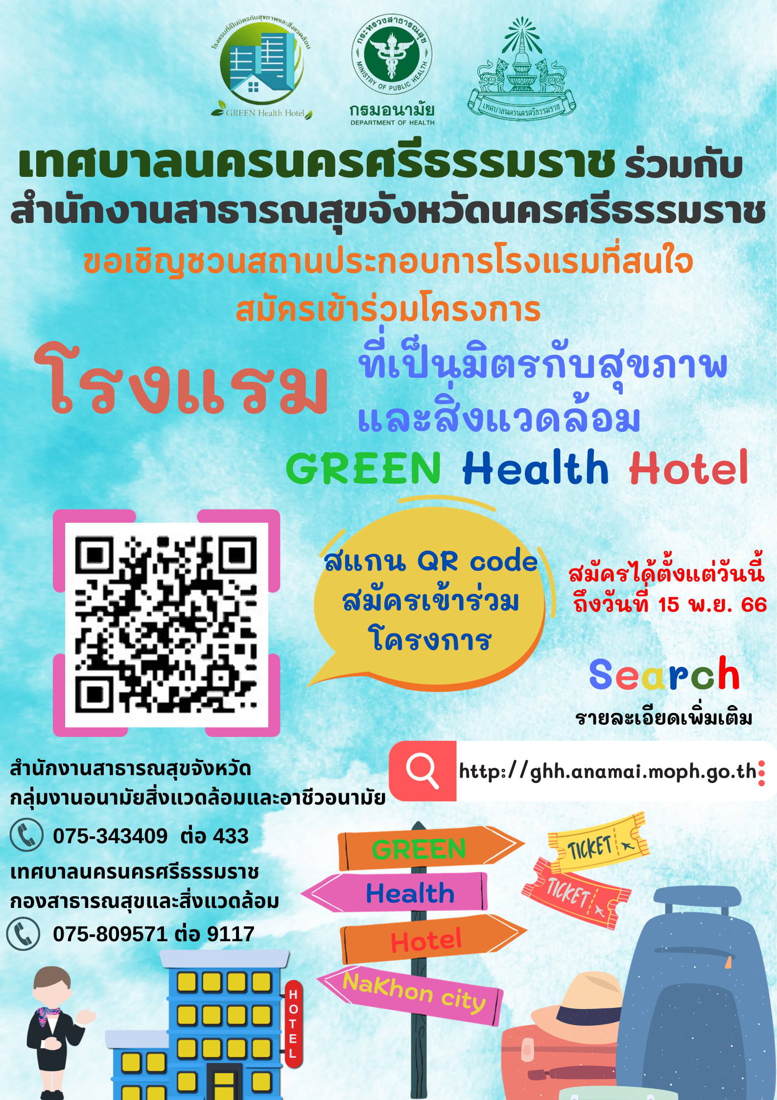 เทศบาลนครนครศรีธรรมราช ร่วมกับ สำนักงานสาธารณสุขจังหวัดนครศรีธรรมราช ขอเชิญสถานประกอบการโรงแรมที่สนใจสมัครเข้าร่วมโครงการ โรงแรมที่เป็นมิตรกับสุขภาพและสิ่งแวดล้อม |